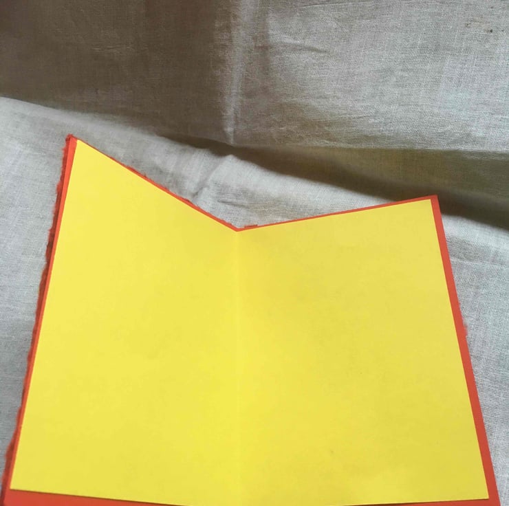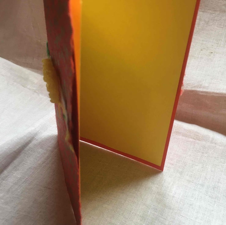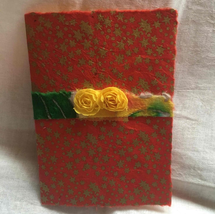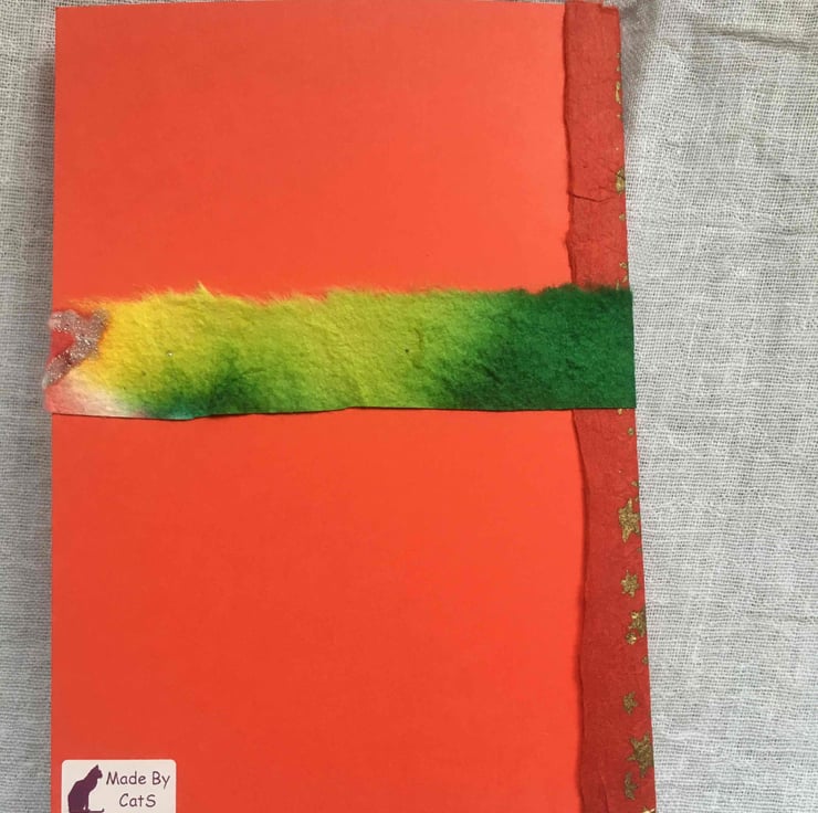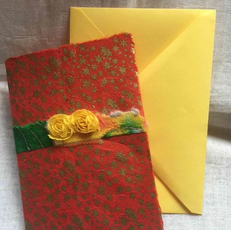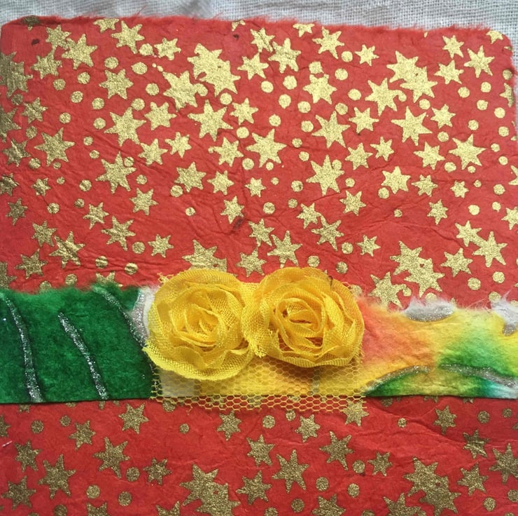 This is a red card with beautiful red and gold star paper on top with a strip of torn colourful paper across the middle. 2 sunshine yellow flowers add the finishing touches.