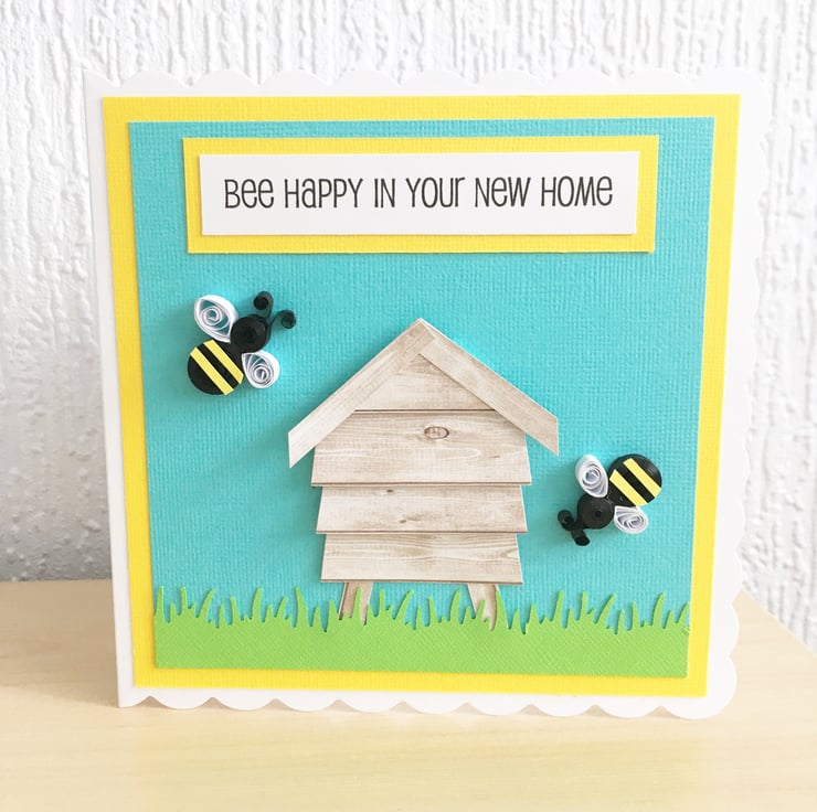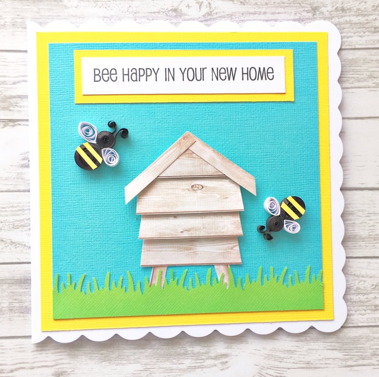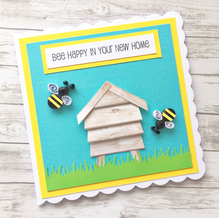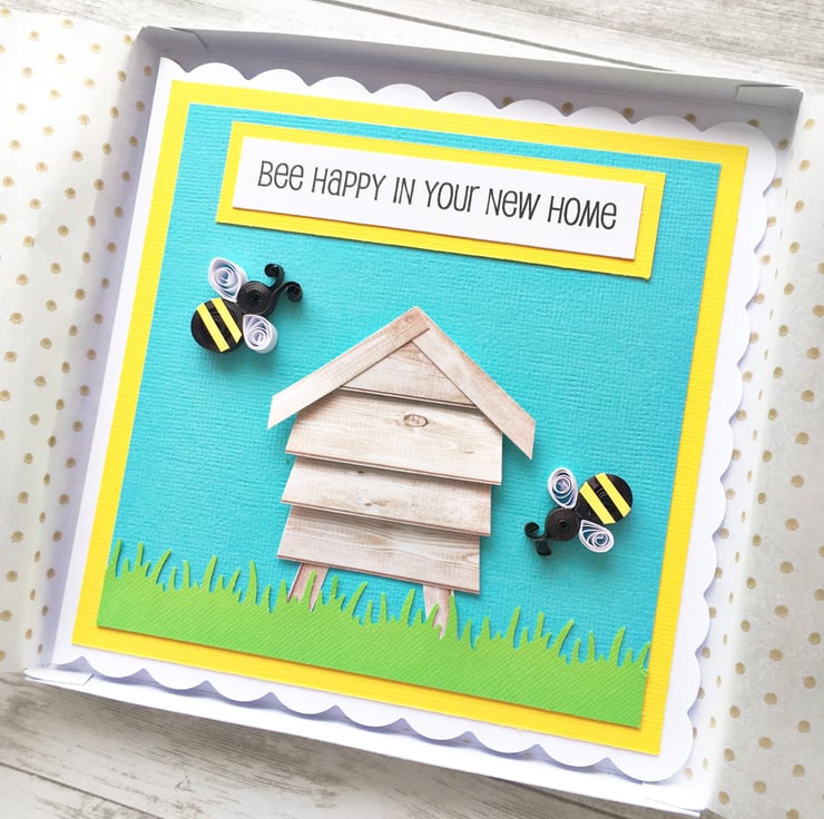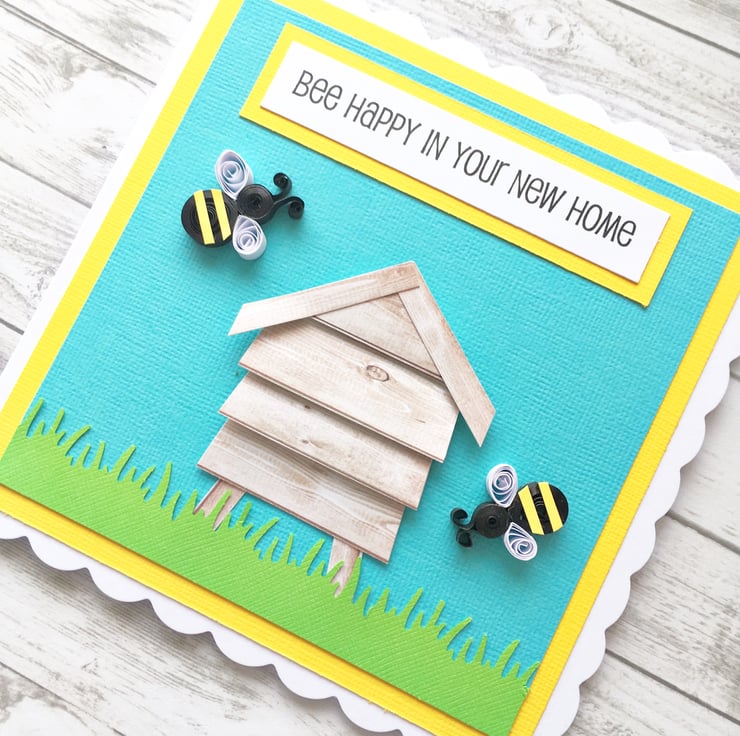 Two quilled bees buzz happily around their three-dimensional wood-effect beehive on a sunny day and the card reads “Bee Happy in your new home.