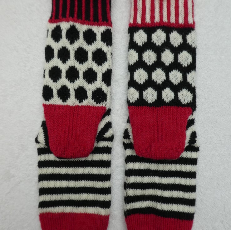 This is a pattern for socks that are knit in the round from the toe up, and can be made in 3 different foot width sizes. The toe is knit in a plain coloured yarn, with the foot of the sock in horizontal stripes. The heel is knit in a slip stitch pattern in a colour to match the toe, with the leg in a fair isle circles pattern. The sock is finished with a two colour alternating rib. Instructions are included for the 2 different colourways. The black and white socks can be knit with a reversed colour sequence to create a funky pair of socks.