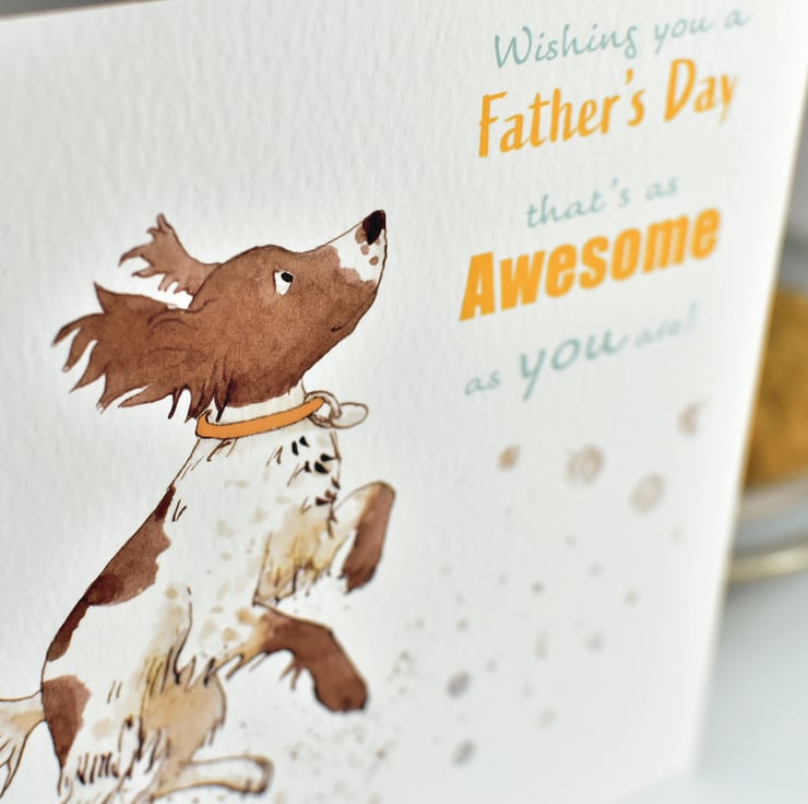 Illustrated greeting card depicting a Liver and White Springer Spaniel dog 'springing' with joy and love on Father's Day. Why not let the Father in your life know exactly how much they are loved with this charming illustrated greetings card.