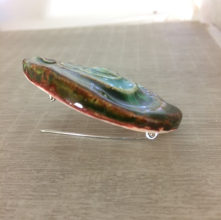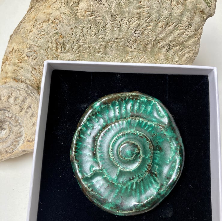 Ceramic brooch created from an imprint of a real ammonite I found on a local walk many years ago. The original is not a perfect specimen which to me makes it more interesting as it is unique in form pattern and texture. The Glaze on this one is malachite earthenware. It gives the brooch an extra dimension and will vary slightly in depth of colour with each firing so please use the photos as a guideline.