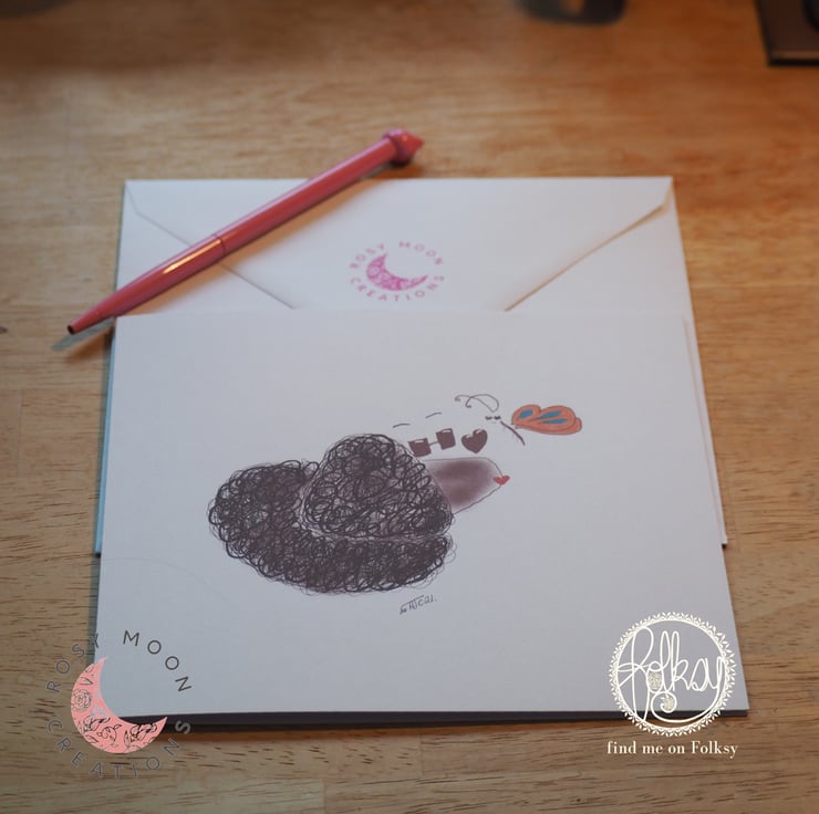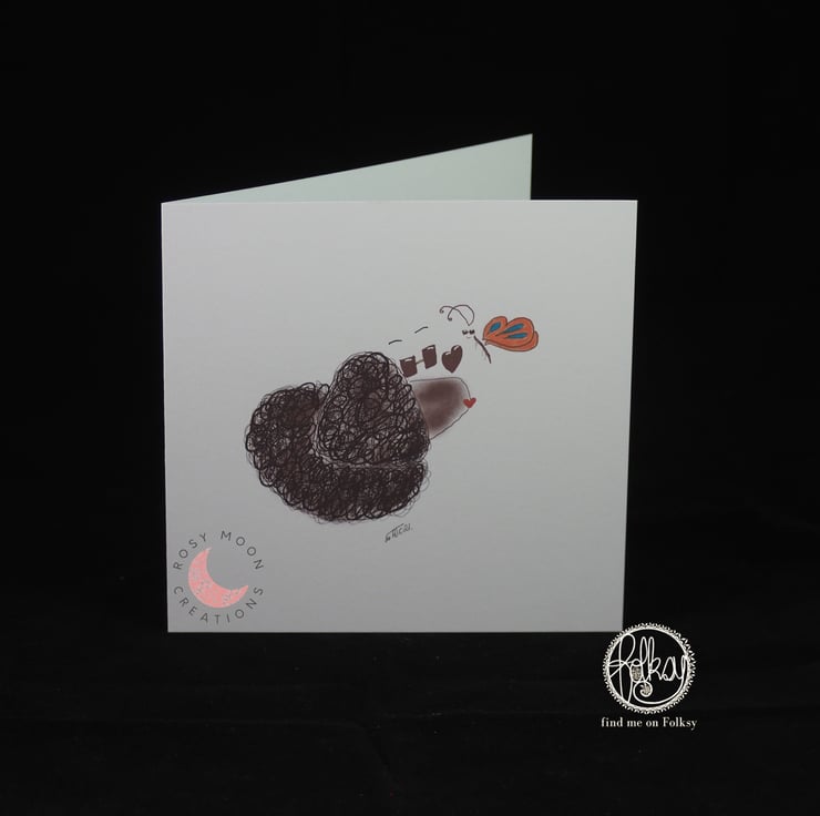 A hand drawn 17x17cm blank card with black poodle and an orange butterfly friend which is perfect for any occasion.