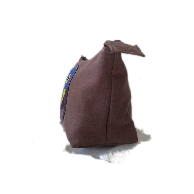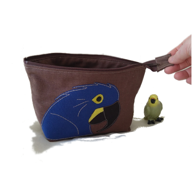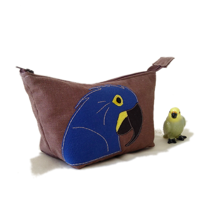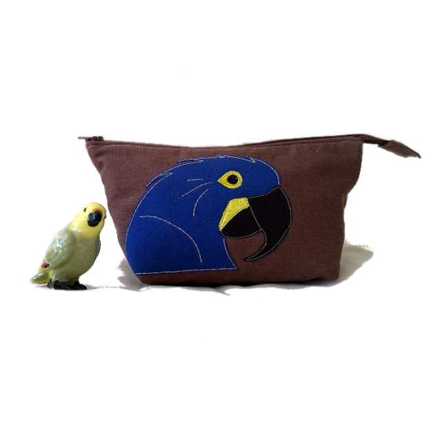 This is an unusual and quirky zipped pouch with a striking Hyacinth Macaw design. The main colour of this pouch is brown which makes the appliqued macaw, with blue head, large black beak and distinctive yellow markings, stand out.