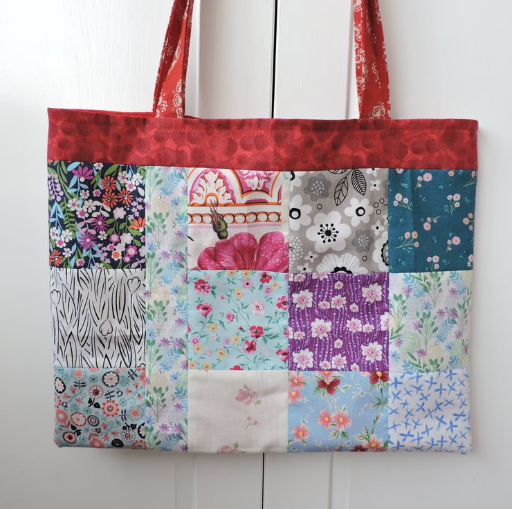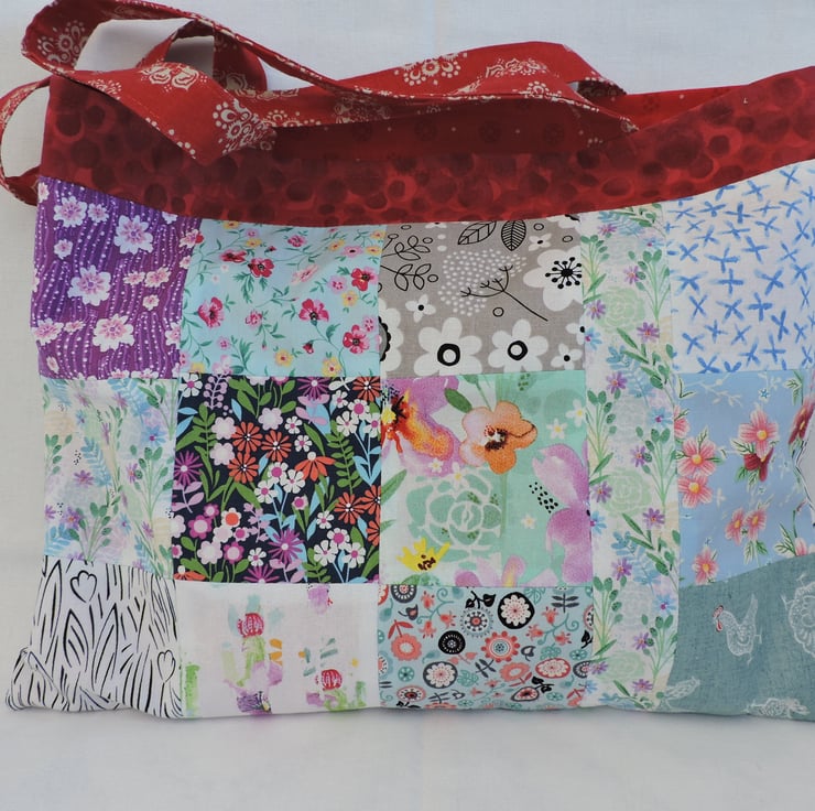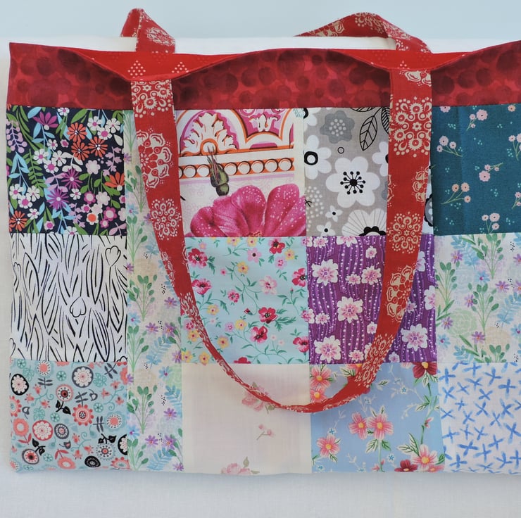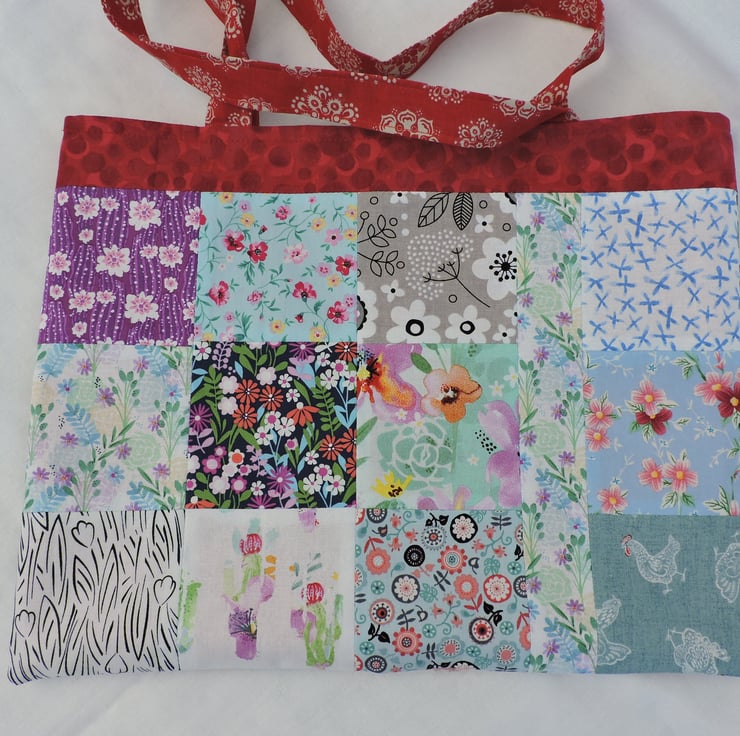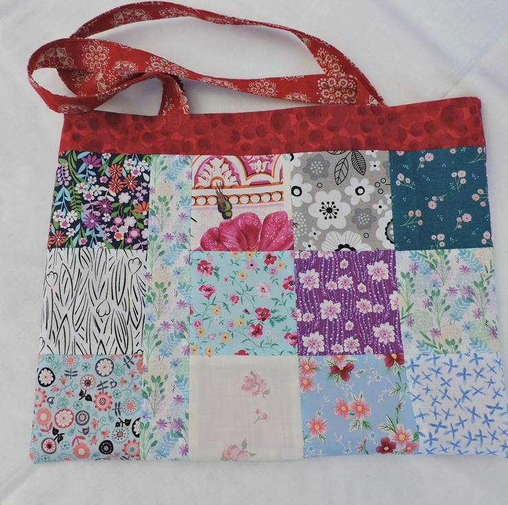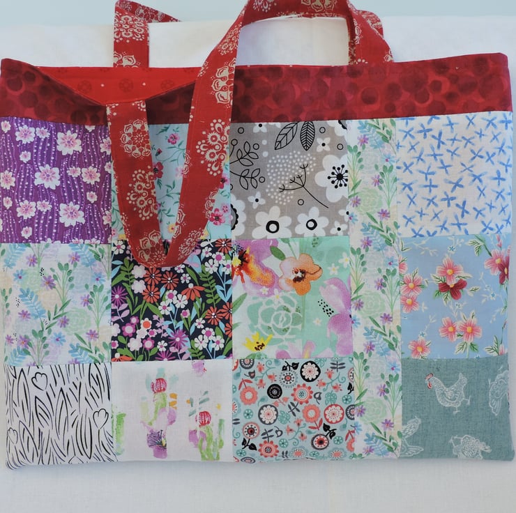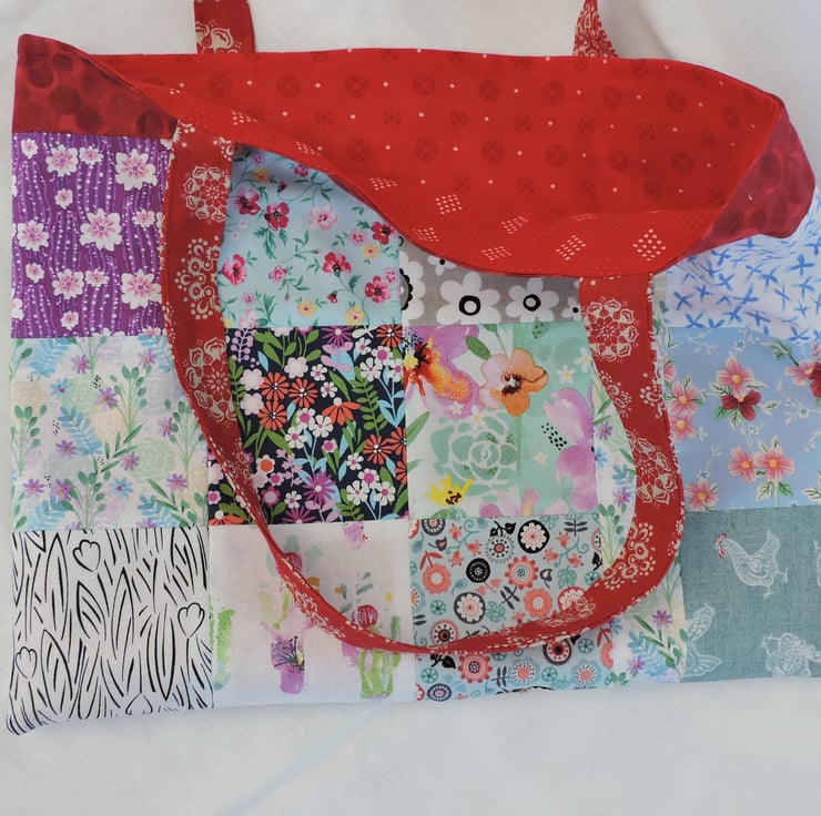 Sale now £5.00 I've made this patchwork tote bag, shopping bag, book bag, craft bag with squares of assorted cotton fabrics. An array of different colours and patterns in red, purple, blue, pink, green, lilac, grey, yellow, white and black. It is fully lined with two pieces of red cotton fabric. This multi coloured bag folds easily to fit in a pocket, bag or suitcase making it the perfect resuable tote bag.