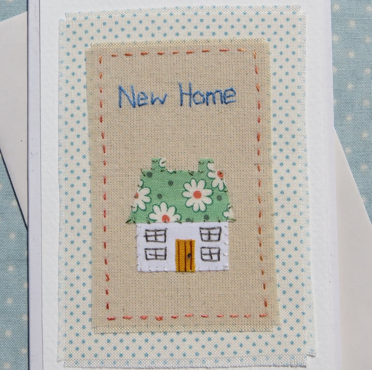A handmade greeting card featuring a hand-stitched miniature applique house with stitched wording, backed with polka dot cotton fabric. Perfect way to send your love and best wishes to anyone moving to a new home. (would look lovely framed too!).