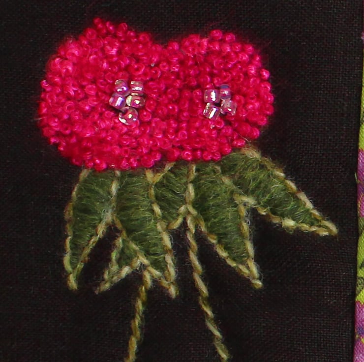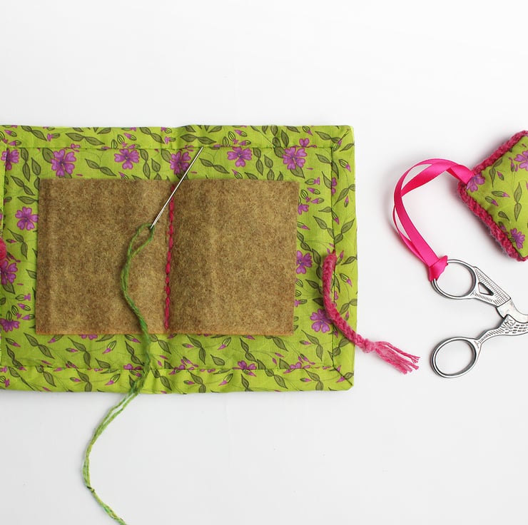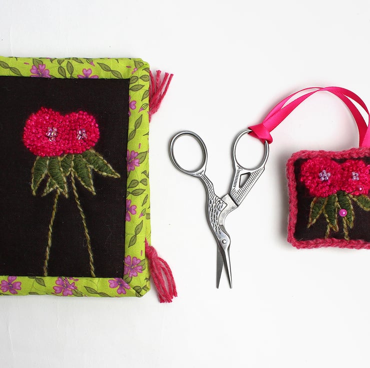 The scissor keeper/pin cushion front is embroidered with matching clover and the back is my Campion print. This has then had a pink coloured crochet trim added around it. The pad is attached with a coordinating ribbon to the scissor handle. It will be easy to identify your scissors and find them with this scissor keeper. The pad can be used to store pins as you are working. The size of the square is 4.5cms(1.75 inches) without the trim. The gold bird scissors are also included in the purchase.