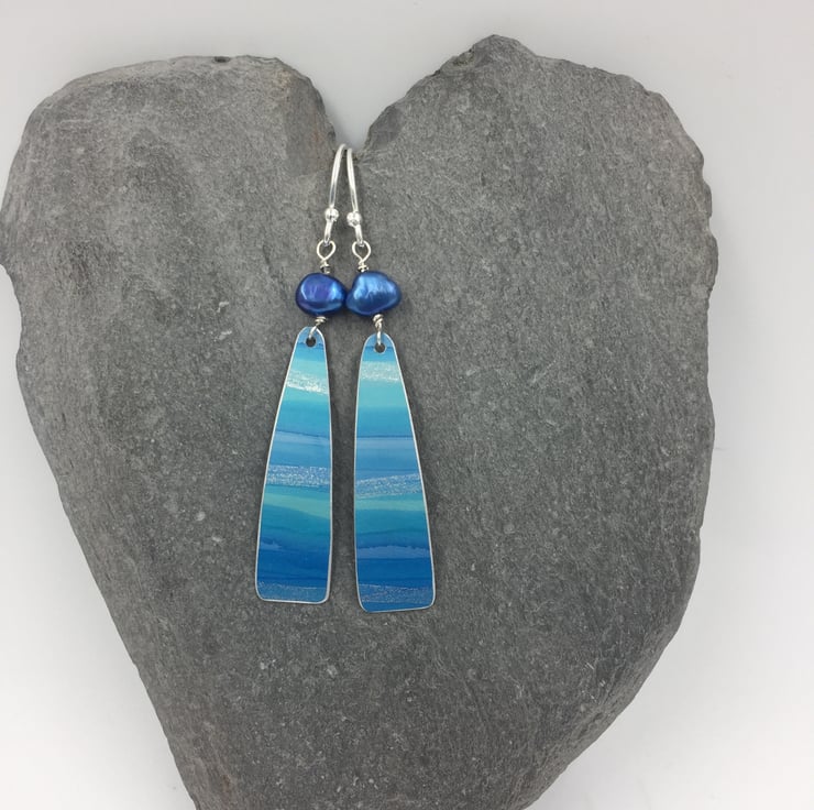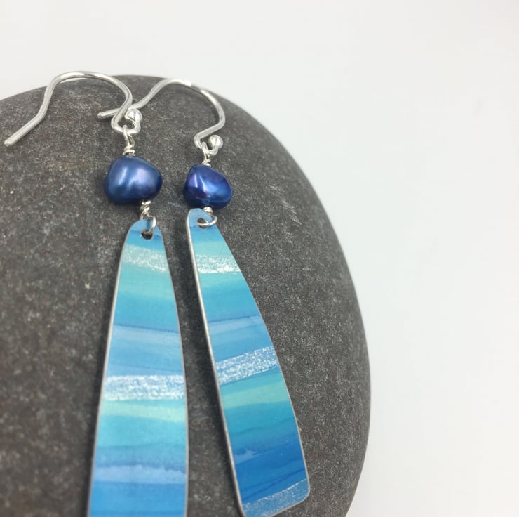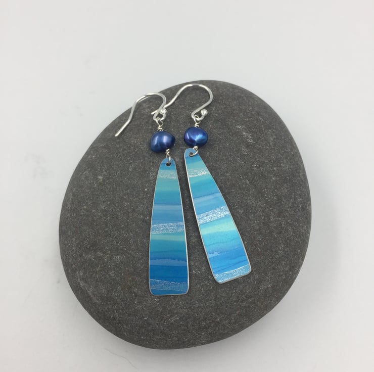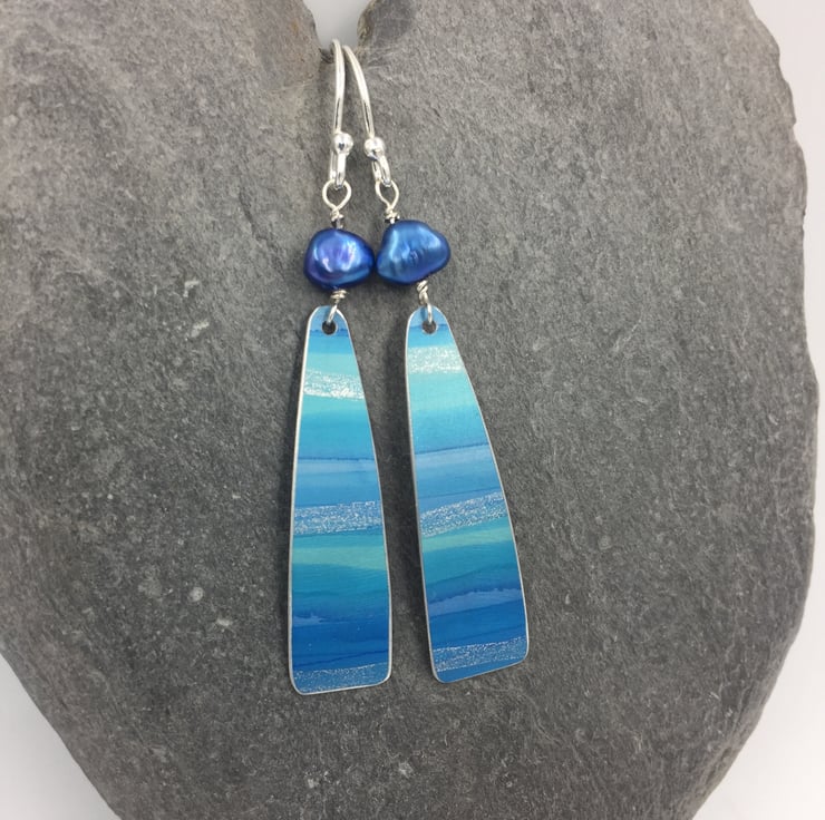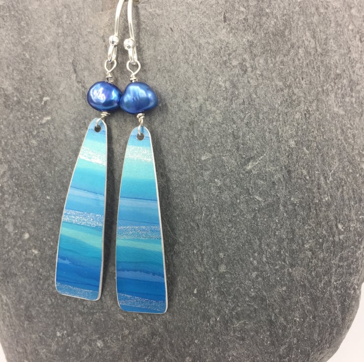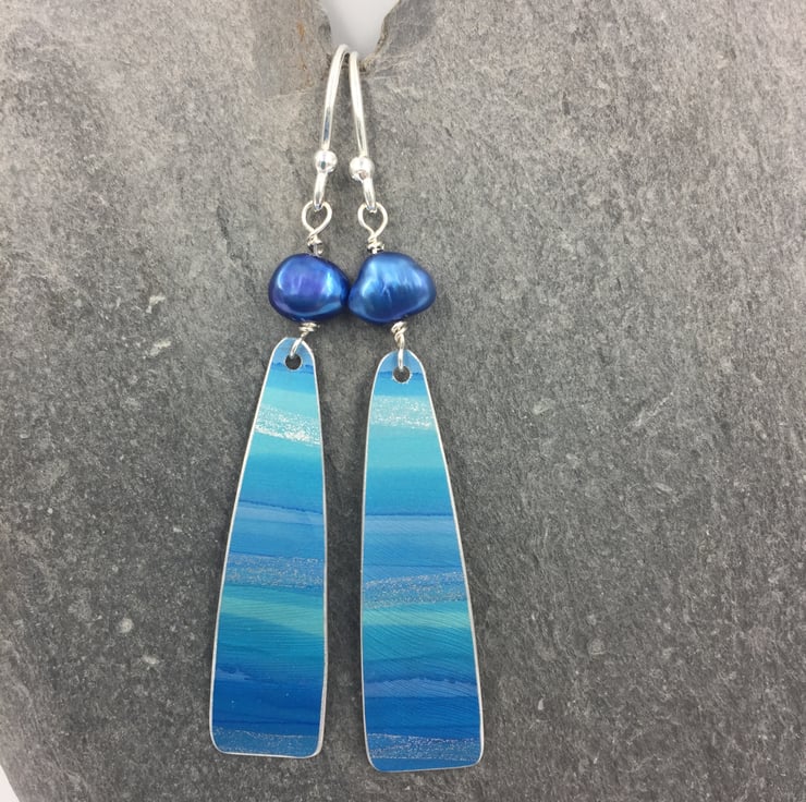 Truly one of a kind hand painted anodised aluminium earrings with a freshwater pearl. I have painted the metal with alcohol inks in blue and turquoise with a subtle silver streak running through to represent the sun shimmering on the waves of the ocean.