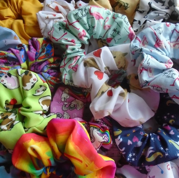 2 Mixed Random Themed Hair Scrunchies. Each one a universal size suitable for children teens or adults. Mixed fabrics including Cotton, Polycotton & Polyester. Designs include animals, magical creatures, dogs, cats, rainbows and lots more.