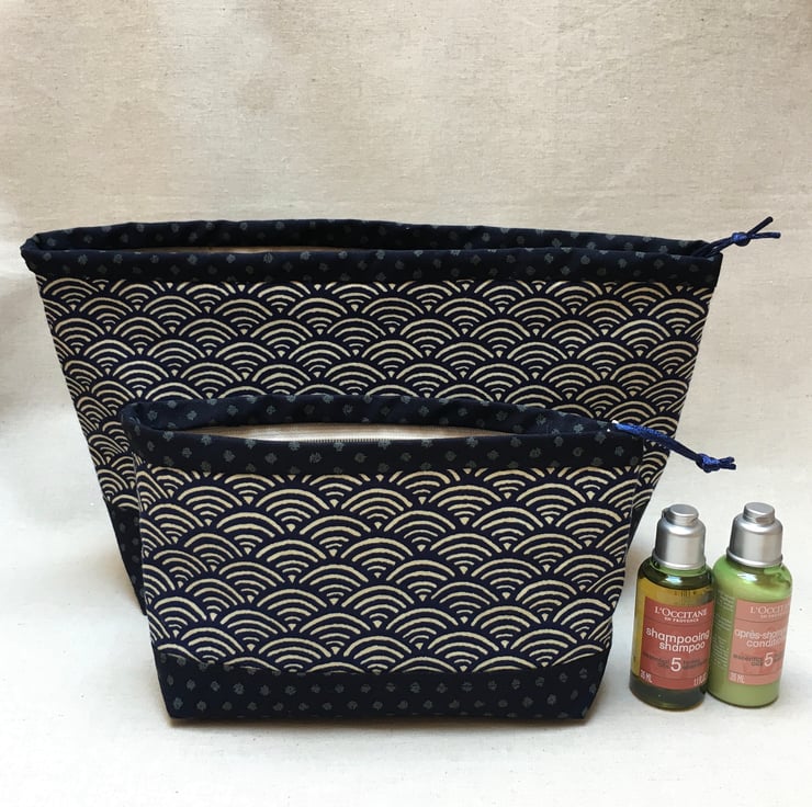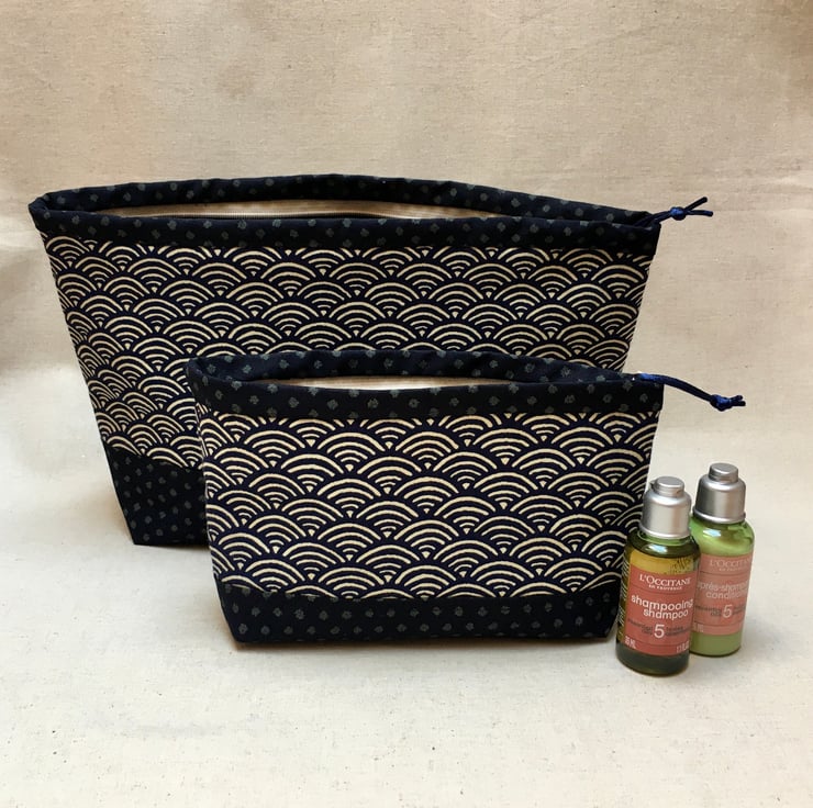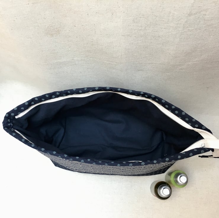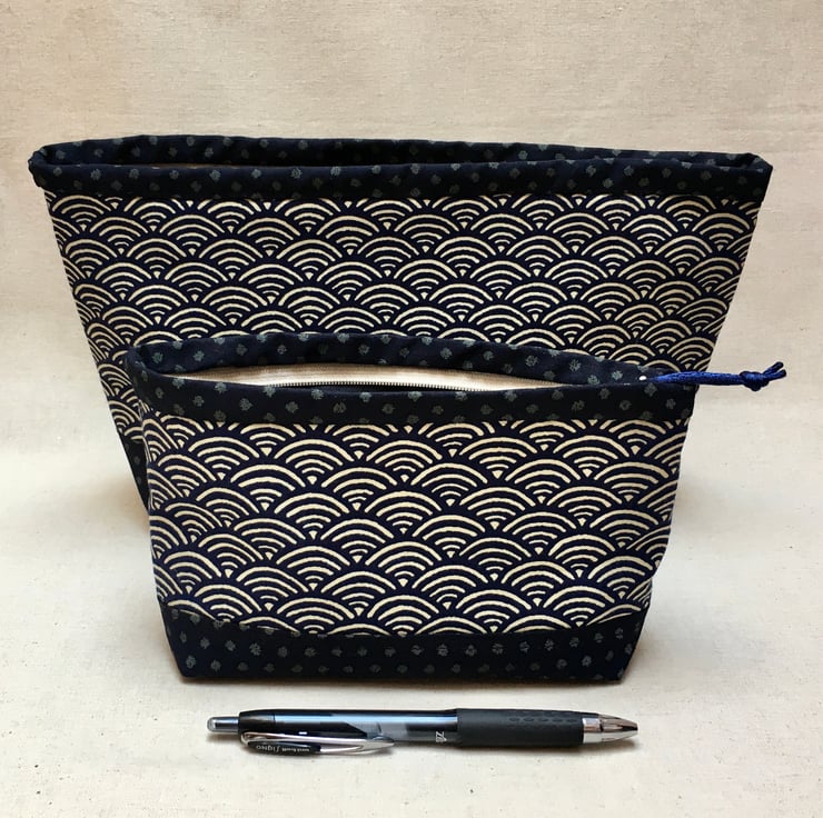 A classic Japanese patterned fabric has been used to create this small zipped pouch. The main pattern depicts Seigaiha, or ocean waves, in indigo and is complemented by a spot like pattern, also from Japan. It has a cream zip and is lined with a midnight blue cotton. The binding around the top of the pouch has been hand sewn. The pouch has been lightly padded to give it structure.