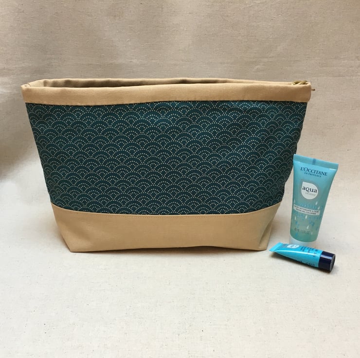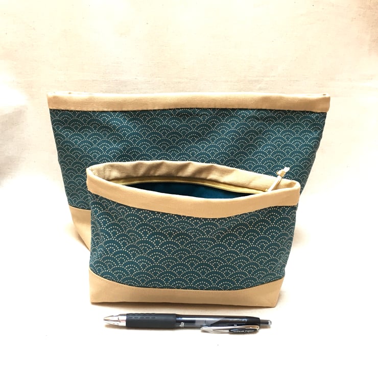 A stylish zipped pouch made from Essex linen and Japanese fabric. The turquoise fabric is Edo Komon Seigaiha, meaning small waves. The arcs of the waves have been created with small beige dots which complements the camel coloured Essex linen. A slightly darker turquoise cotton fabric has been used for the lining and the zip is gold in colour. The binding around the top of the pouch has been hand sewn.