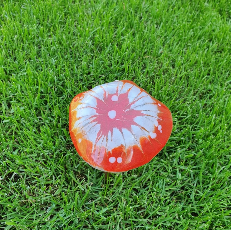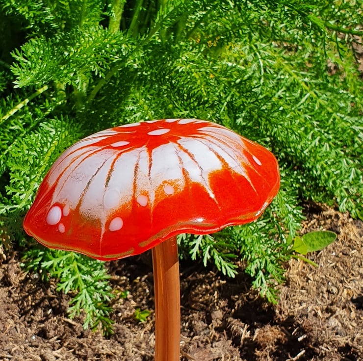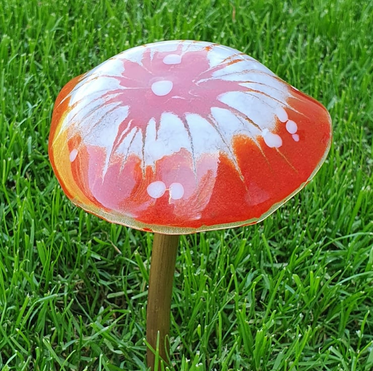 This fused glass mushroom sits on a copper pipe which means it can be used in the garden or indoors in a plant pot.