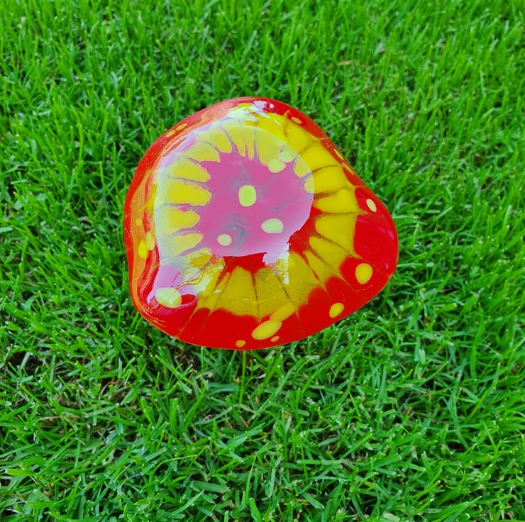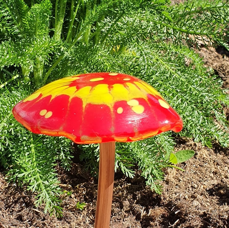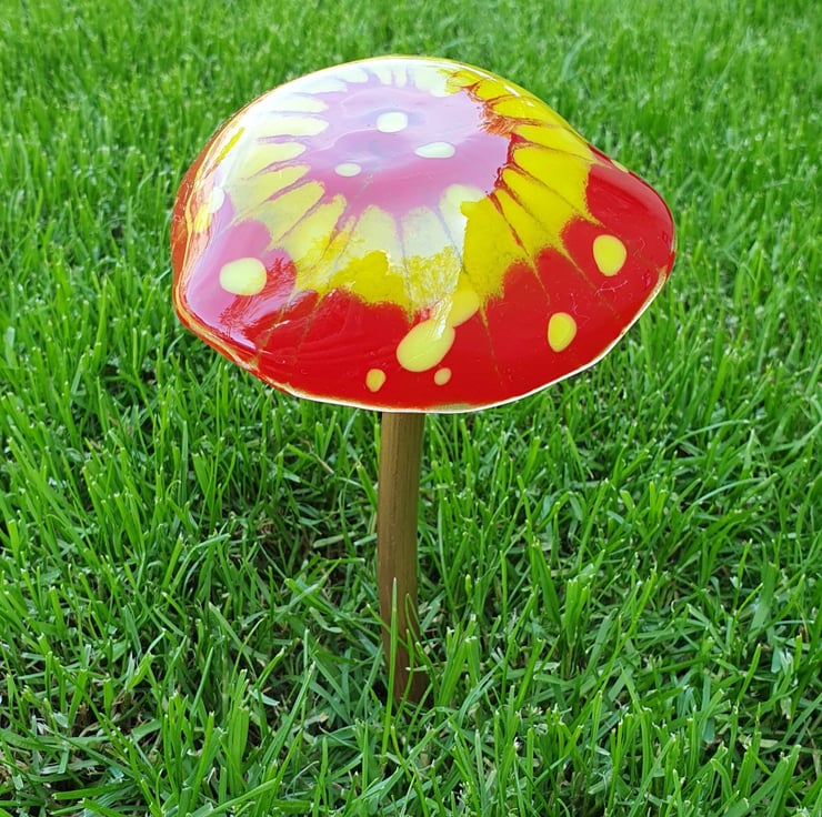 This fused glass mushroom sits on a copper pipe which means it can be used in the garden or indoors in a plant pot.