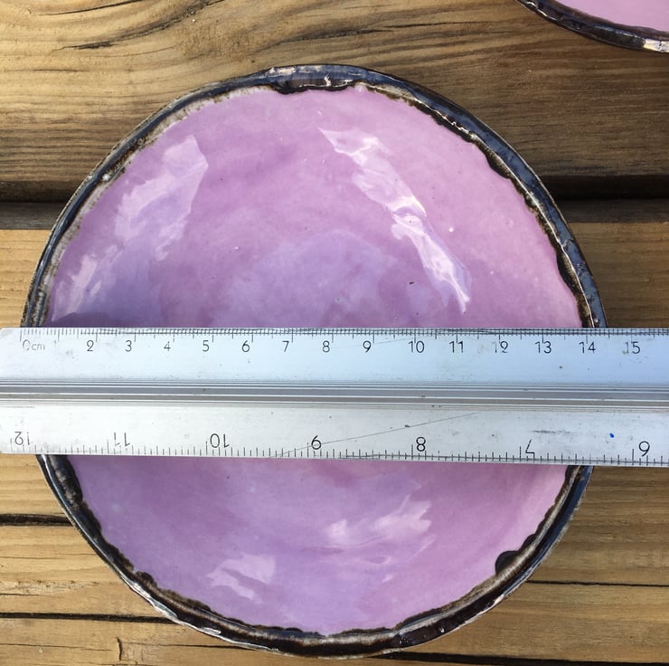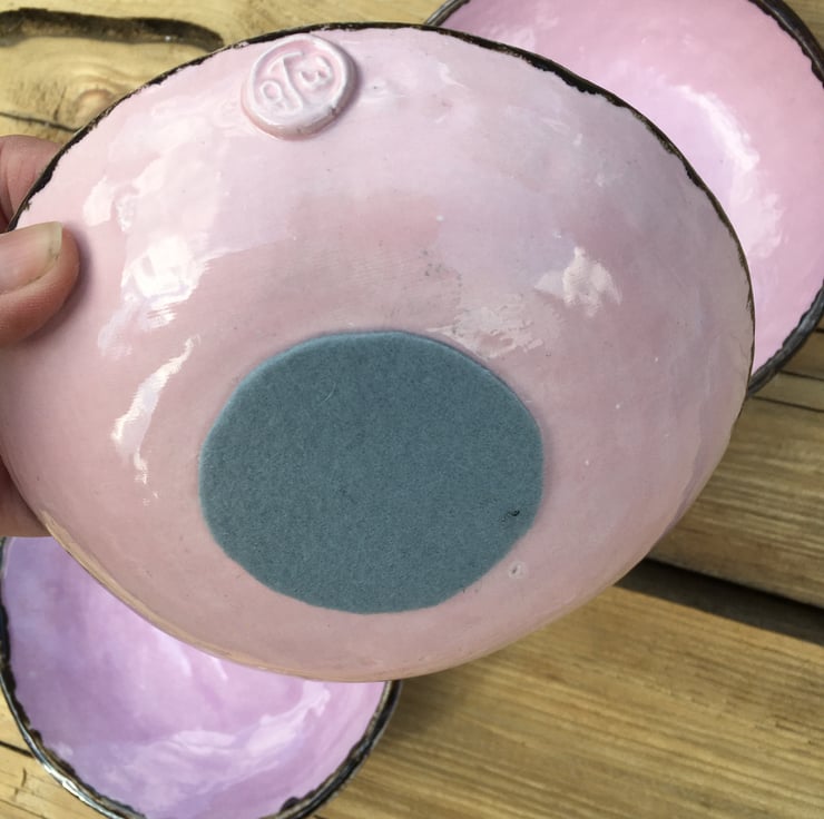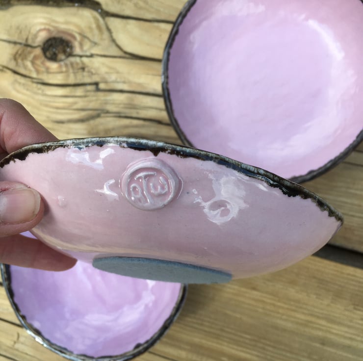 The bowls are in different shades of pink and lilac, the glazes are designed to mix and match, an antique gold glaze has been used as a decorative feature along the edge of the bowl