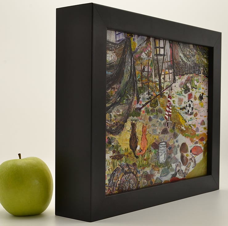 This is an original, one-off acrylic painting on paper pressed on to board. Varnished and presented in a contemporary deep black frame for an 8x10 inch work. Ready to hang with felt stickers to avoid marking walls or can be freestanding. My initials are on the front, and the work is signed and dated at the back. Comes with a note of authentication.