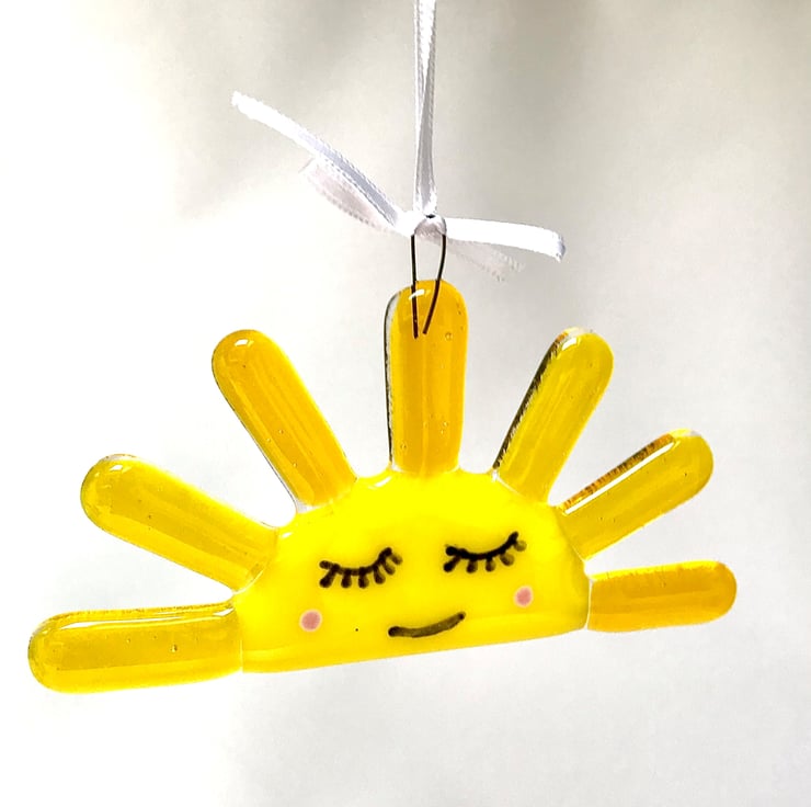This cute burst of sunshine is made from individually hand cut pieces of glass which are decorated with glass paint and fused into one piece hung on white satin ribbon. It measures approx 11.8cm wide and 6cm high without the ribbon.