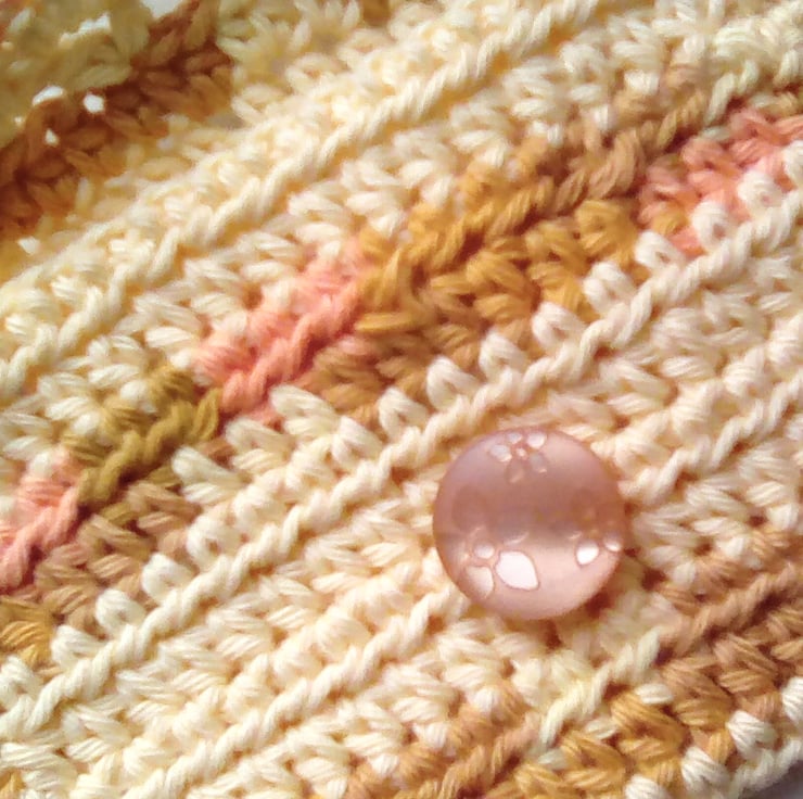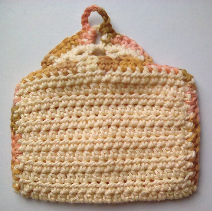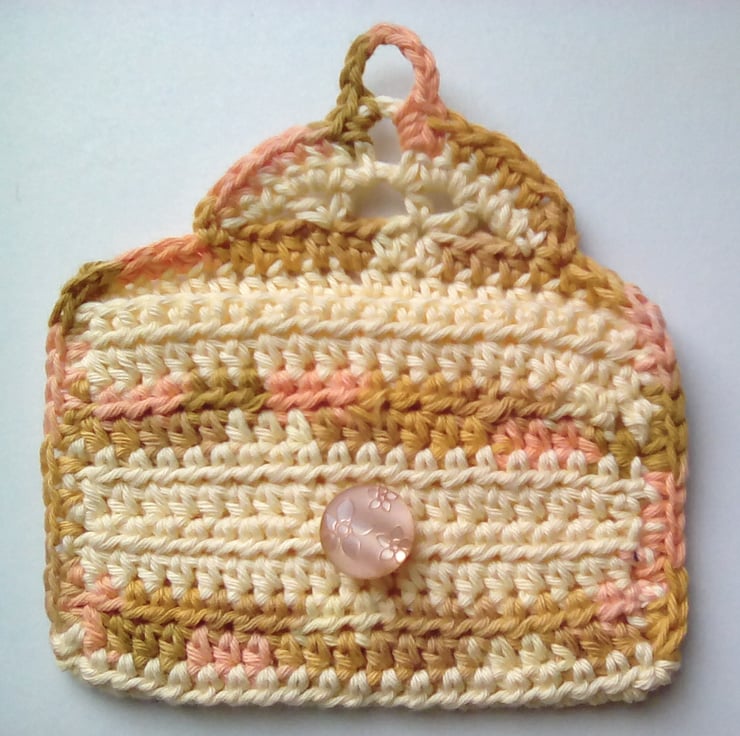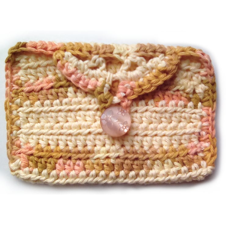 Handmade wallet crocheted from cotton. There's room for cards and notes etc. The button closure has a flower detail on it. It would make a lovely little gift.