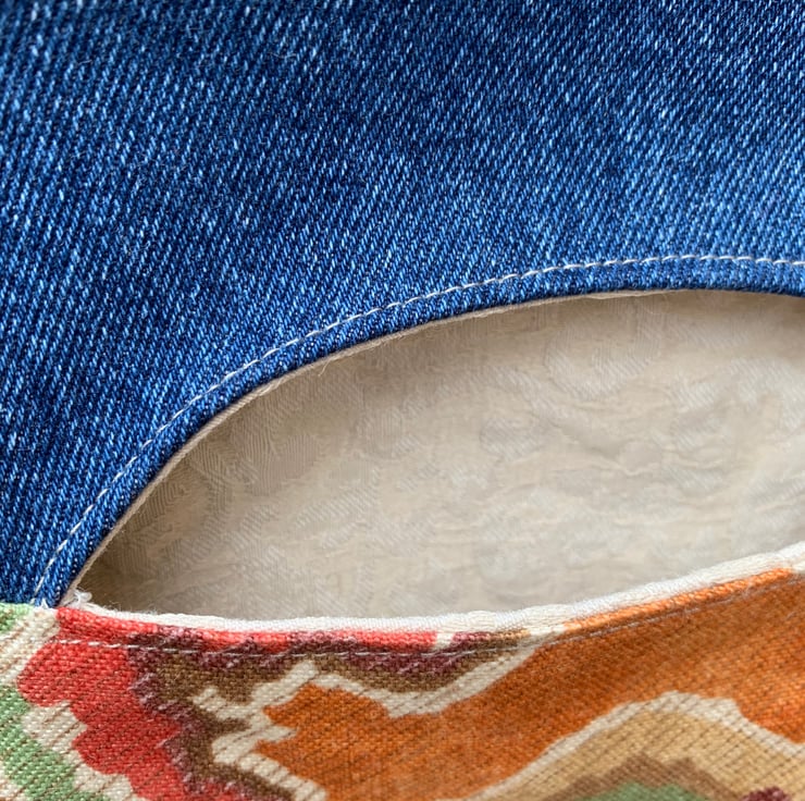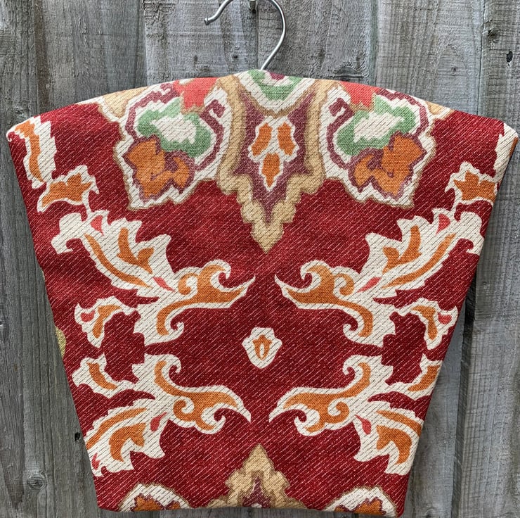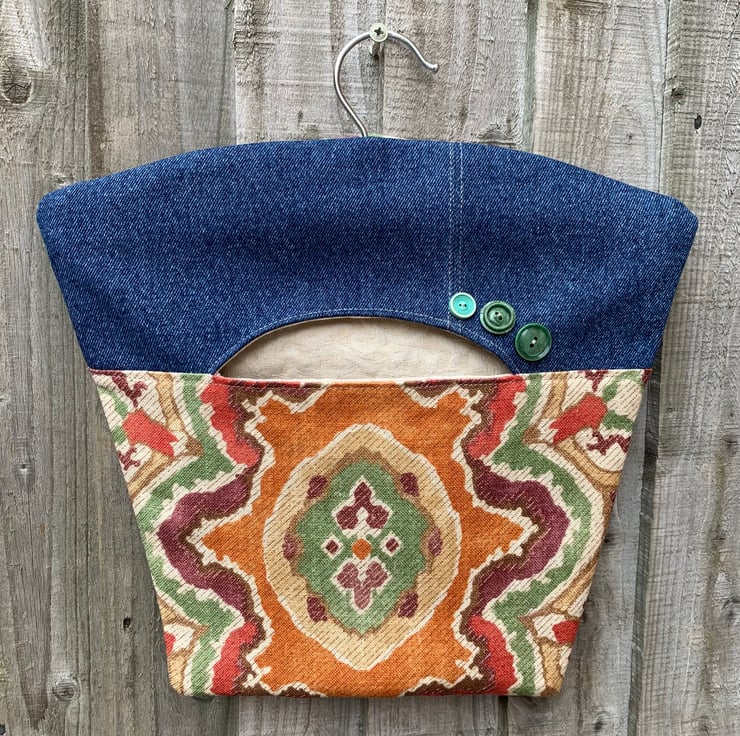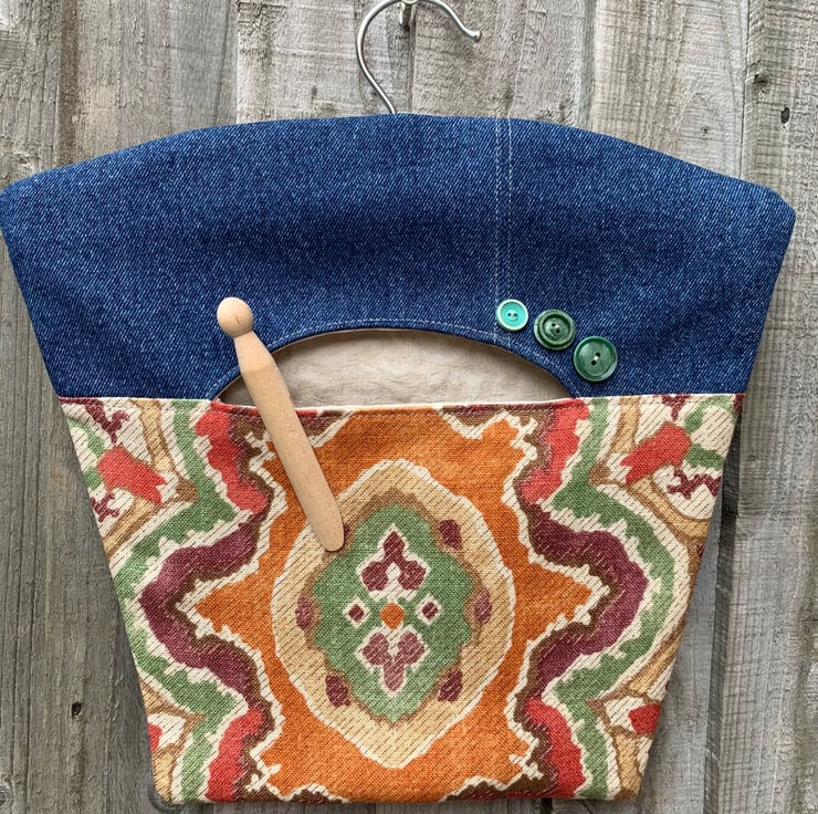 Pretty peg bag made from a sample piece of Osborne and Little Berber linen-mix and reclaimed denim from old jeans. Fully lined with thick reclaimed curtain fabric. It hangs from a strong wood and metal hanger.