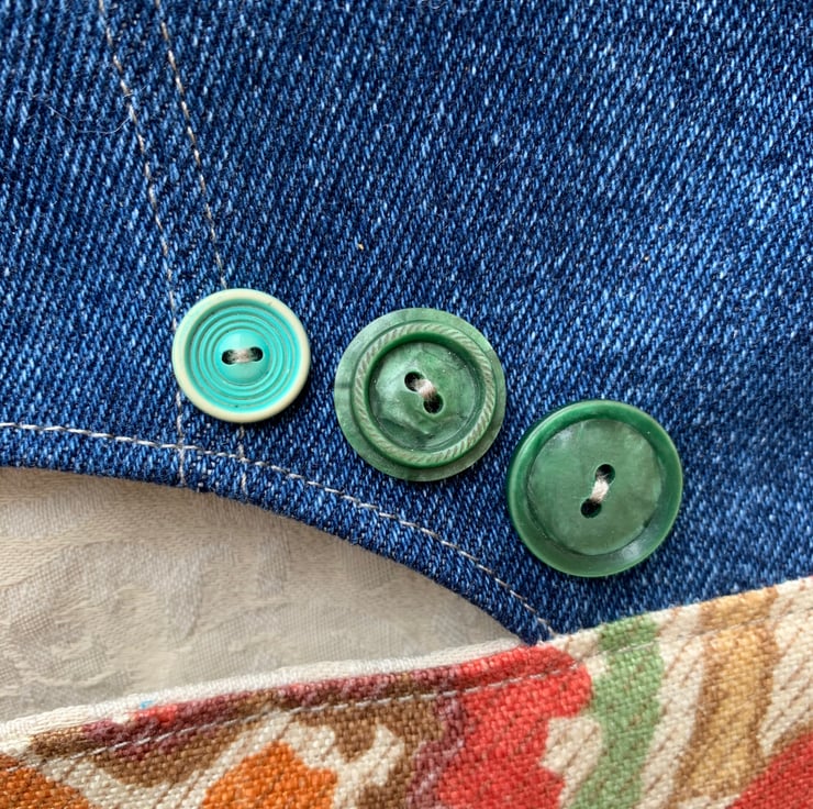 The bag measures 32cm wide by 28cm deep (excluding hanger). It is decorated with 3 old green buttons.