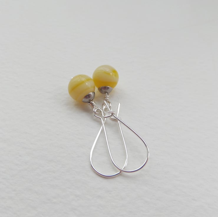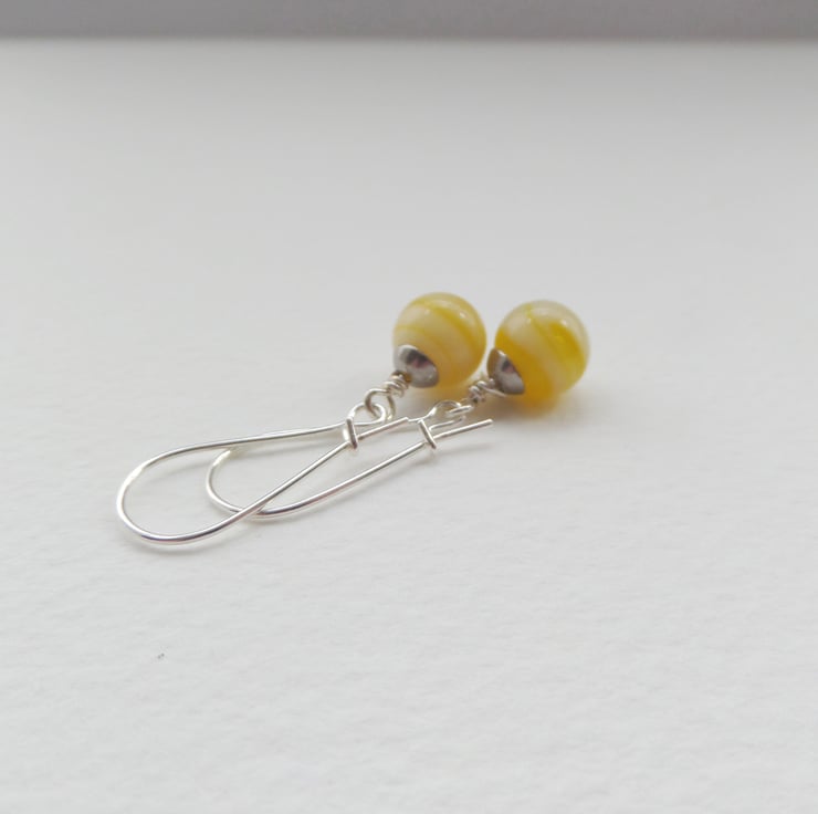 On silver plated secure kidney wire hooks, these are medium drop, yellow stripy glass beaded earrings. A summery, everyday pair, these are lightweight.
