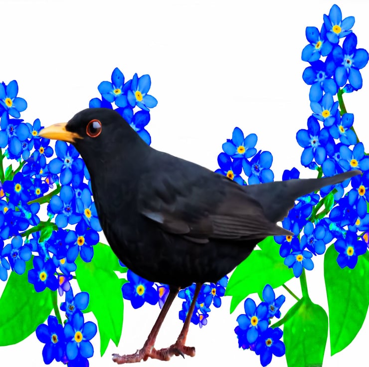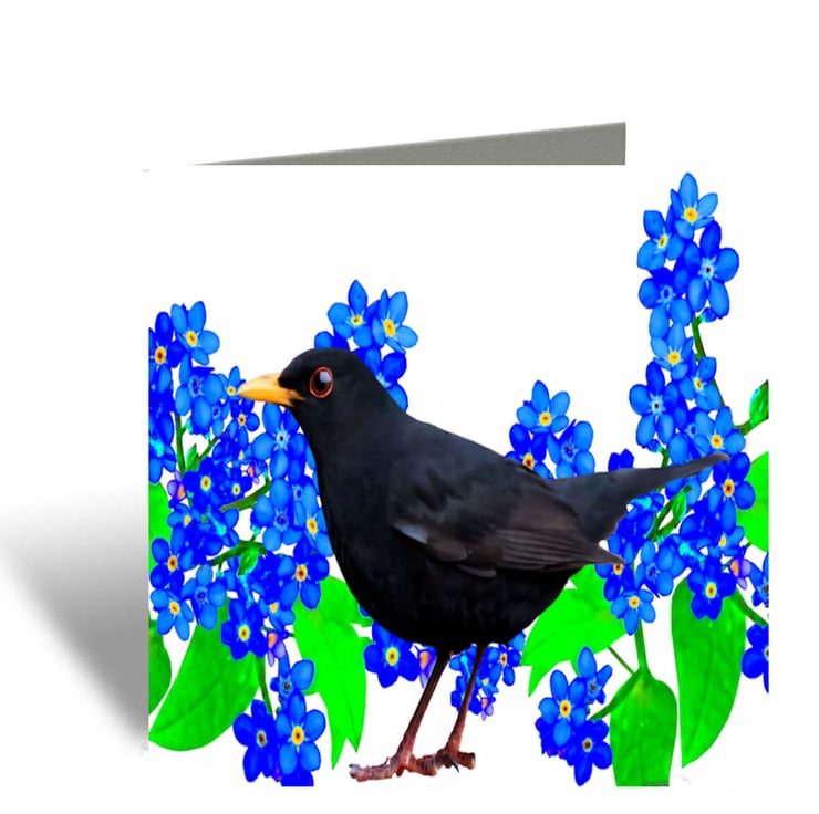This Blackbird Greeting Card has stunning colours; he is sitting amongst the beautiful blue flowers - Forget Me Nots.