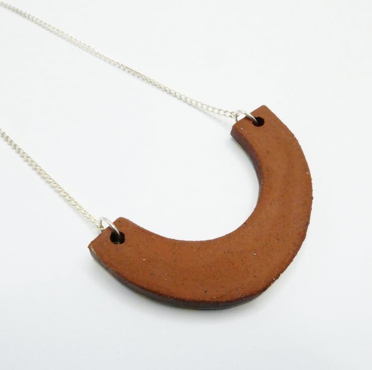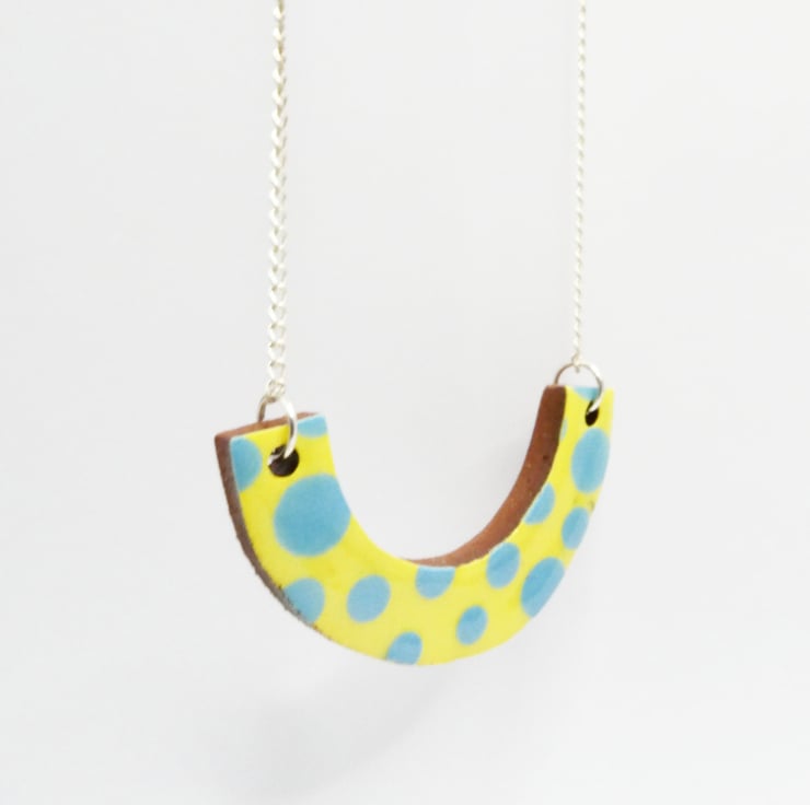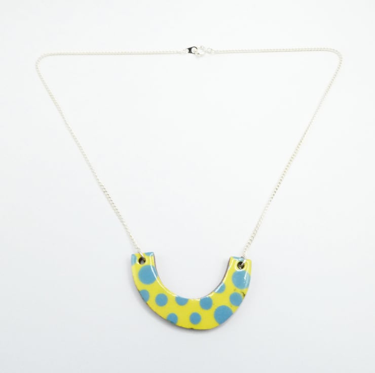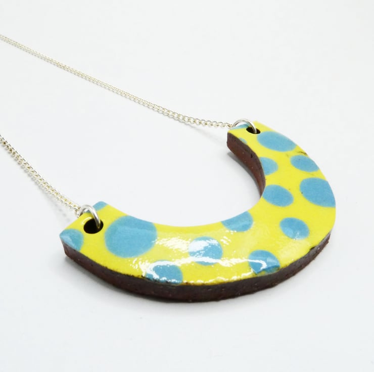 This is a yellow and blue inverted arch shaped necklace suspended on a silver plate curb chain necklace. The pendant is made from an Etruscan terracotta clay and has been printed on the surface using bright coloured slips, this is then finished with a clear glaze to make the colours pop. The necklace has a ring clasp.