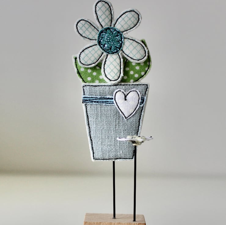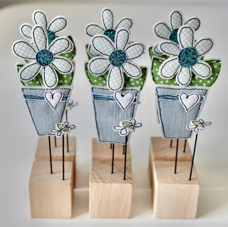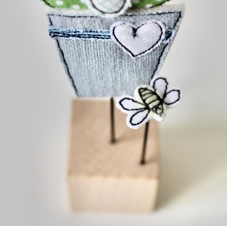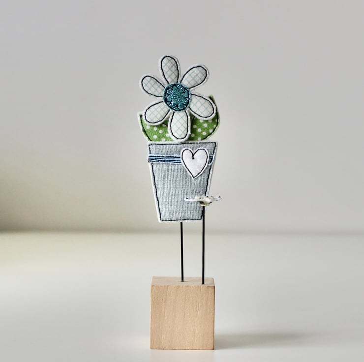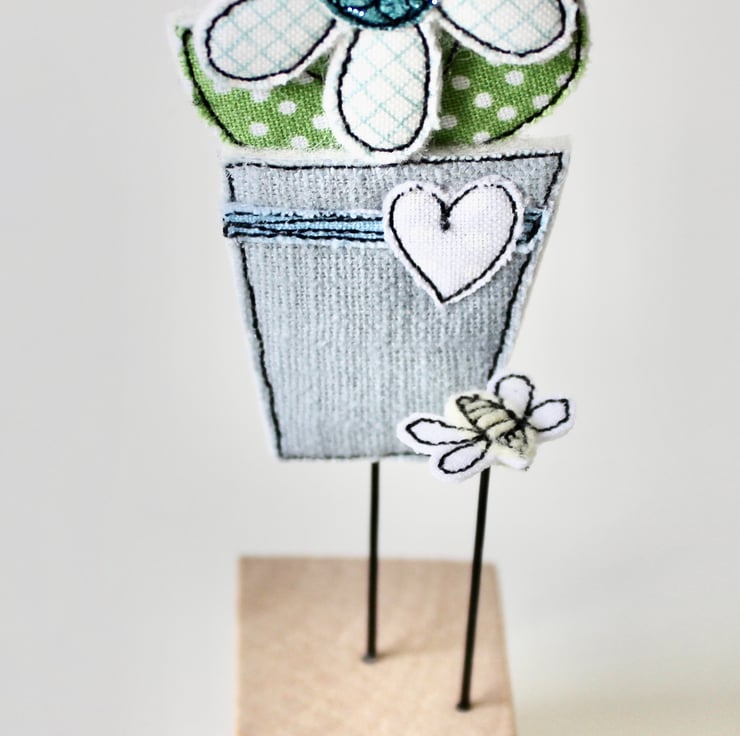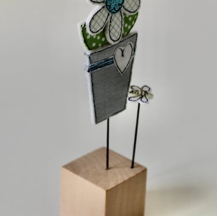 Flowerpot and Bee are created using 100% wool felt, glitter cloth, cotton cloth, free hand machine embroidery and are cut out by hand using very sharp scissors. They are mounted on a 3cm cube wooden block, which can adorn a mantle piece or any flat surface.