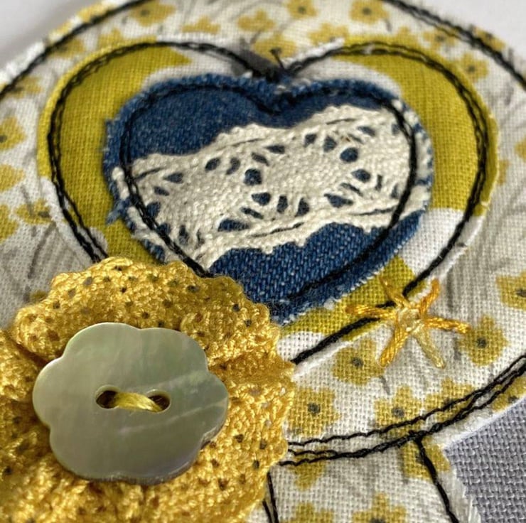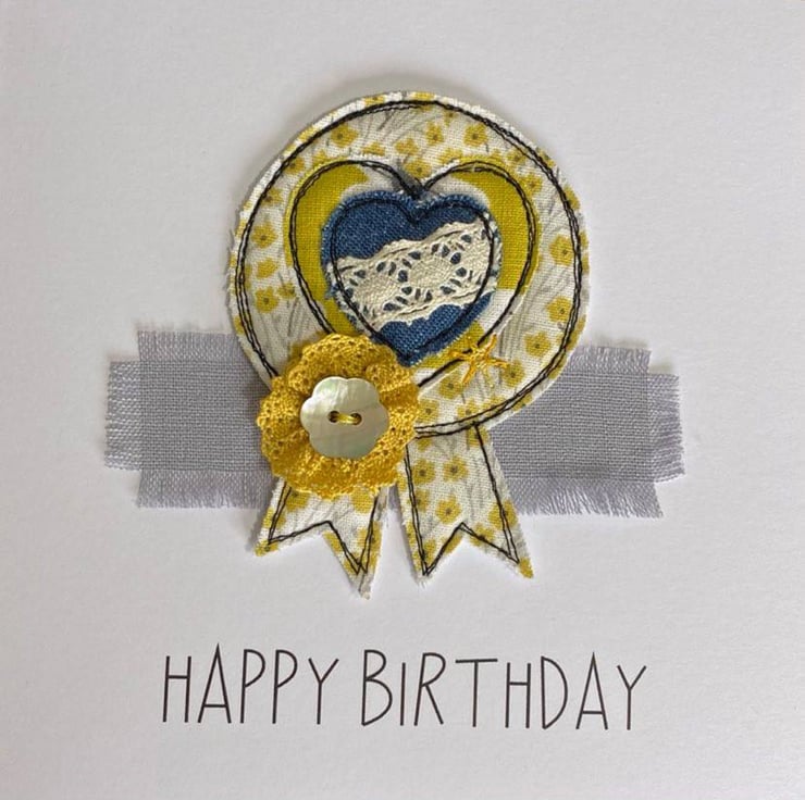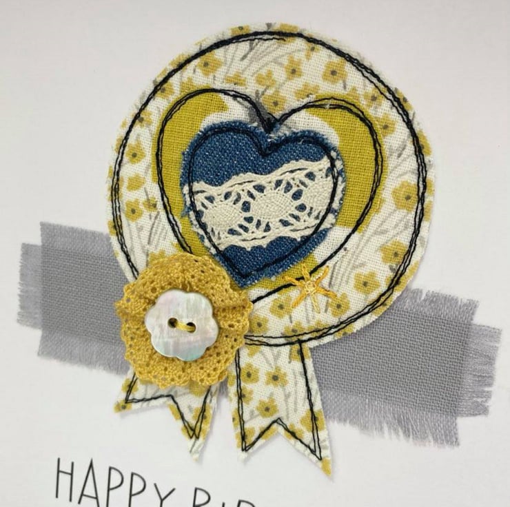 This is a pretty textile 'happy birthday' rosette style card stitched using Denim, Lace, printed Cotton and quality felt fabrics. There is a small strip of Grey hand fringed Linen and a flower shaped pearl effect button.