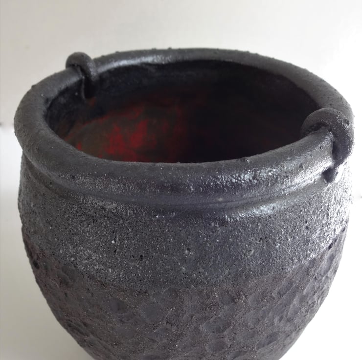 This striking textured bowl can be used as a stand-alone piece of art, a posy bowl, a houseplant pot, or to hold your keys, pens, buttons or all those other little things we accumulate as part of everyday life. I handmade the shape from black stoneware clay, texturing a wide central band while the clay was still soft, and finishing the top rim with two little rolled circlets of clay. The inside is glazed with a finish that fires red in parts, to add an exciting touch to the interior. The outside has a little touch of glaze at the top, but the main part is left unglazed to give a matt natural clay finish. Because the outside is natural clay, it’s not intended for food use, so no milk and cornflakes please! Called Tara, the bowl is 11 cms high and 10 cms diameter across the top.