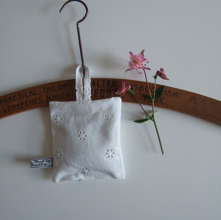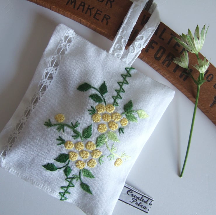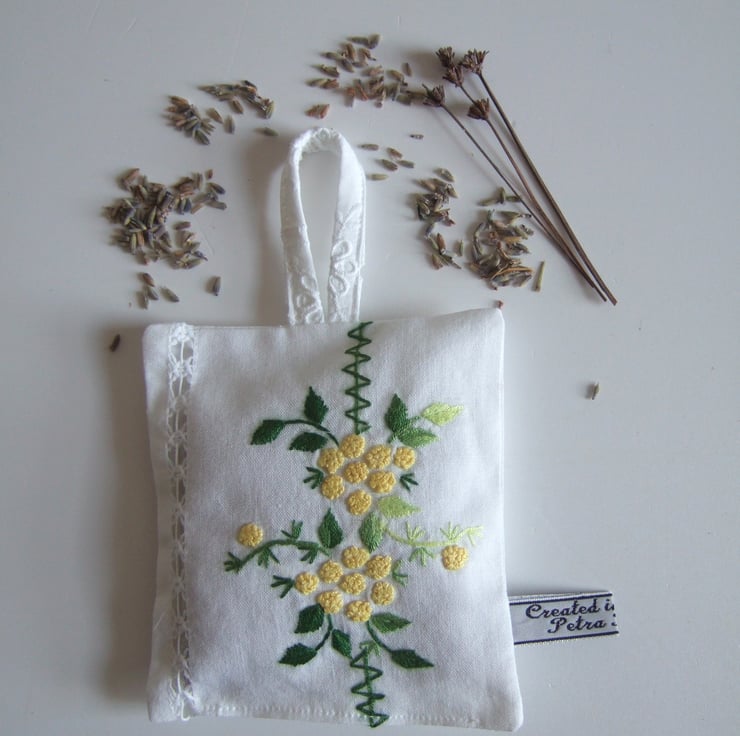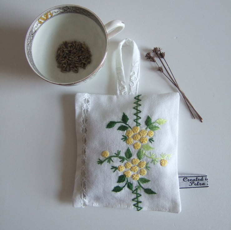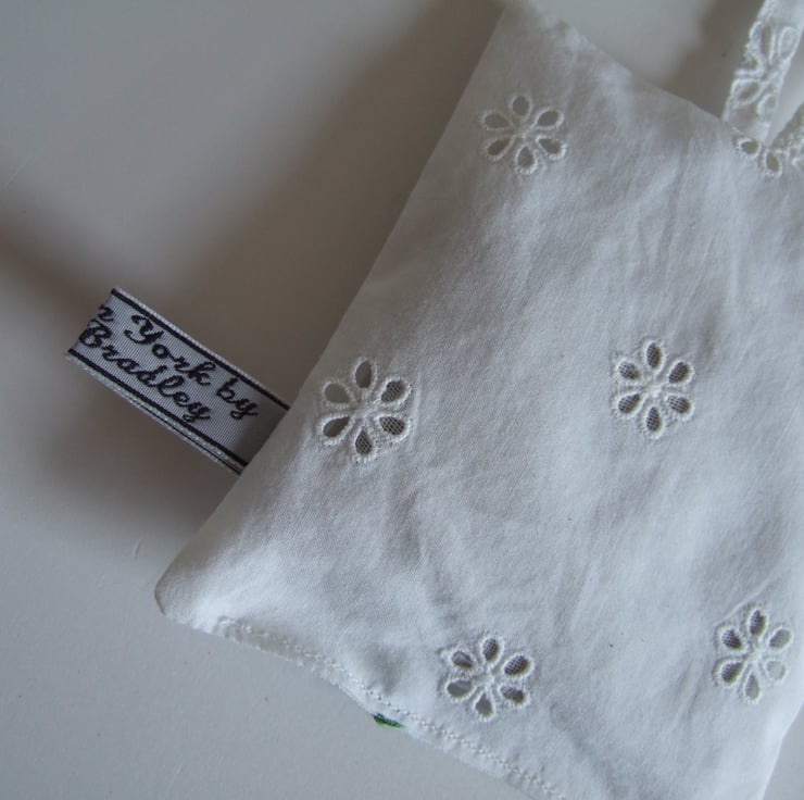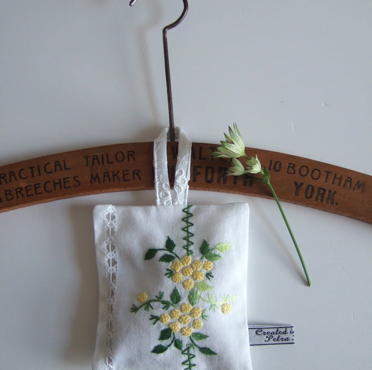 The front is a yellow floral design with some drawn thread work to help the scent escape through the tiny holes. The back is soft, vintage broderie anglaise.