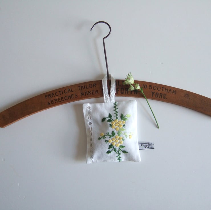 This sweet lavender bag is made from a fragment of embroidered vintage bedlinen. There are yellow flowers and green leaves embroidered on the front, and the back is cut from softly worn, vintage, broderie anglaise. Inside is nestling a little bag of dried lavender from North Yorkshire. Lavender has been used for centuries to aid sleep, scent clothes, and as a natural remedy for keeping out moths! So, pop it in a drawer for sweet smelling delicates, or under your pillow for healthy sleep. This little bag would make a lovely present for someone learning to embroider, for a fan of vintage textiles, or for Mum.