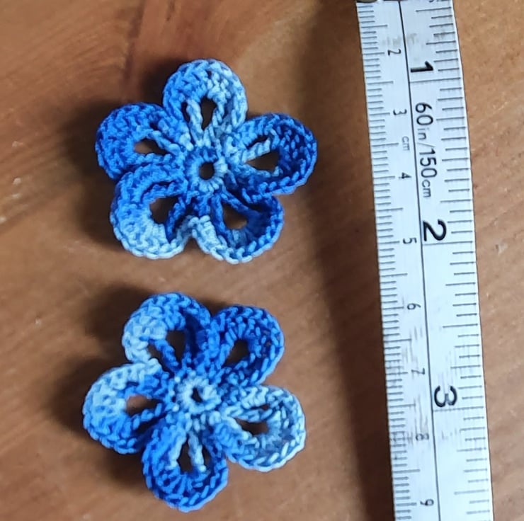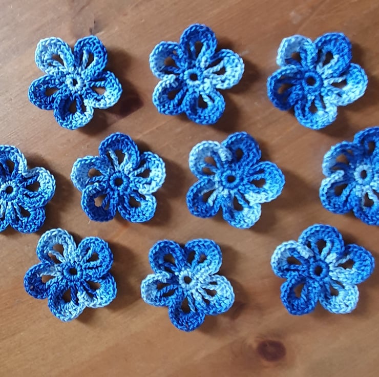Pack of 10 - five petal flowers in blue, muticoloured, 100% cotton thread