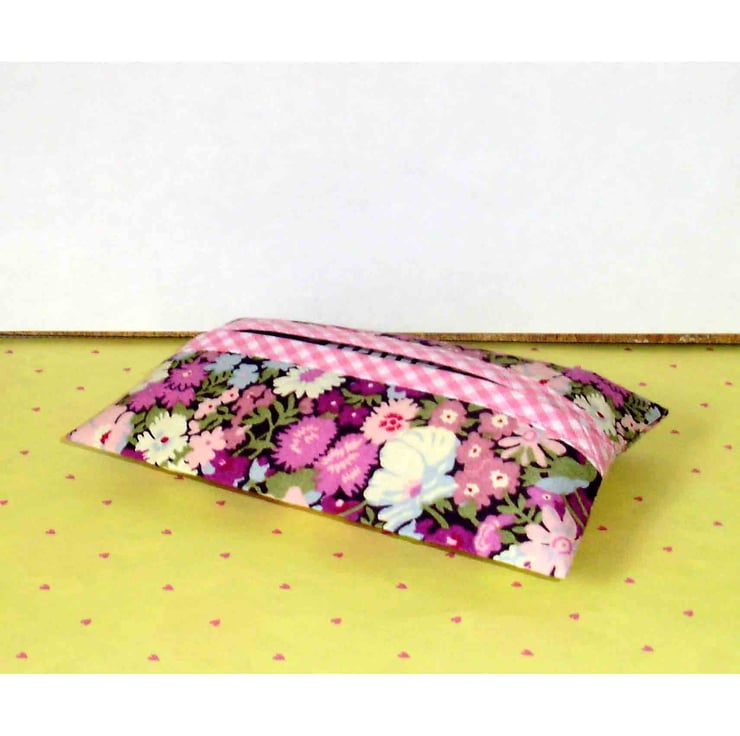 This is a handy holder for a pocket pack of tissues, ideal for the handbag. Made from a pretty vintage style (new fabric) Liberty print, the holder is lined for softness and strength, with toning binding.