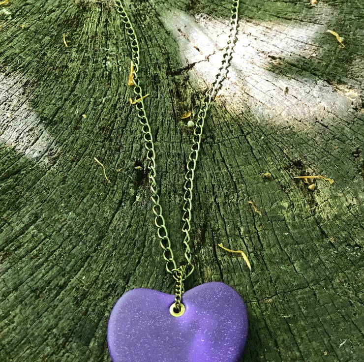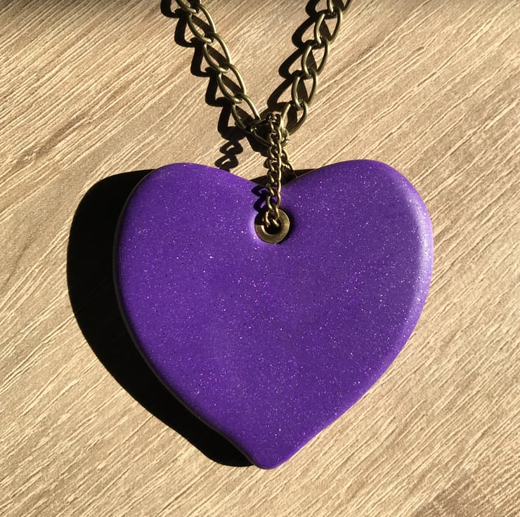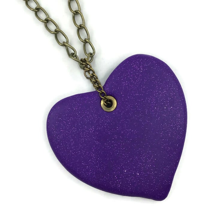 Chunky purple polymer clay pendant suspended from antique brass chain featuring an attractive magnetic clasp.