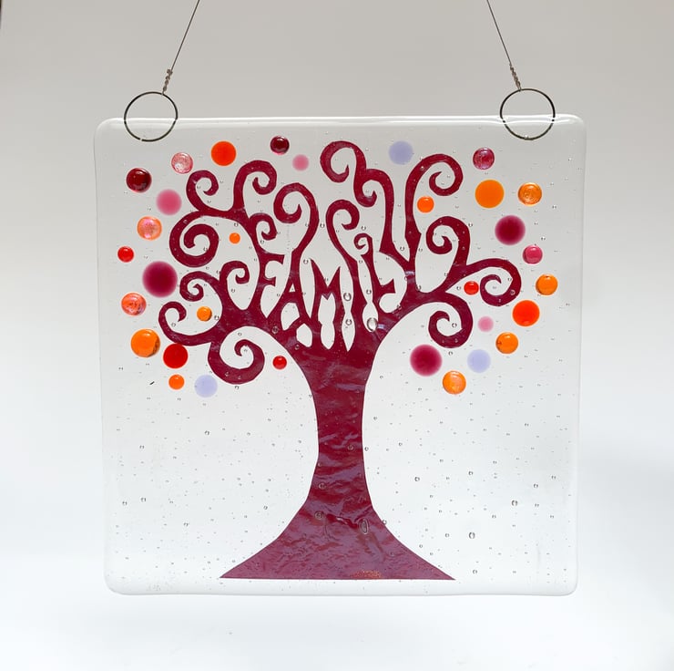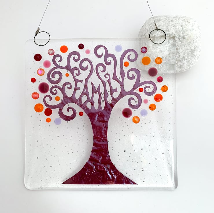 Fused glass hanging tree suncatcher featuring the word "family" hidden in the branches. Fresh Spring colours, inspired by my love of nature and wildlife. A beautiful gift, perhaps for a relative, it looks lovely in a window, giving a splash of fresh colour.