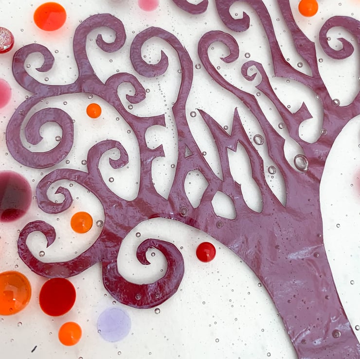 To make this hanging, I hand cut copper foil with a scalpel to make the trunk and branches of the tree and sandwiched it between 2 layers of art glass. This is then fused slowly overnight in my kiln. I then add coloured and dichroic dots which I have made previously to give some added interest to the design. A second firing is done overnight the next day to tack fuse the dots onto the design, so that they stand proud of the glass, giving it a 3D effect.