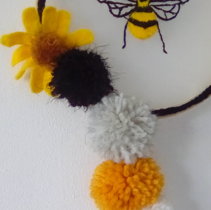I have hand embroidered this Bumble Bee onto White Voile fabric, adding felt and beads for effect. I have added a Felt flower and small pompoms in a variety of colours. This Bumble Bee hoop would look great in any home decor. The outside of the hoop has been decorated with a crochet wool trim.