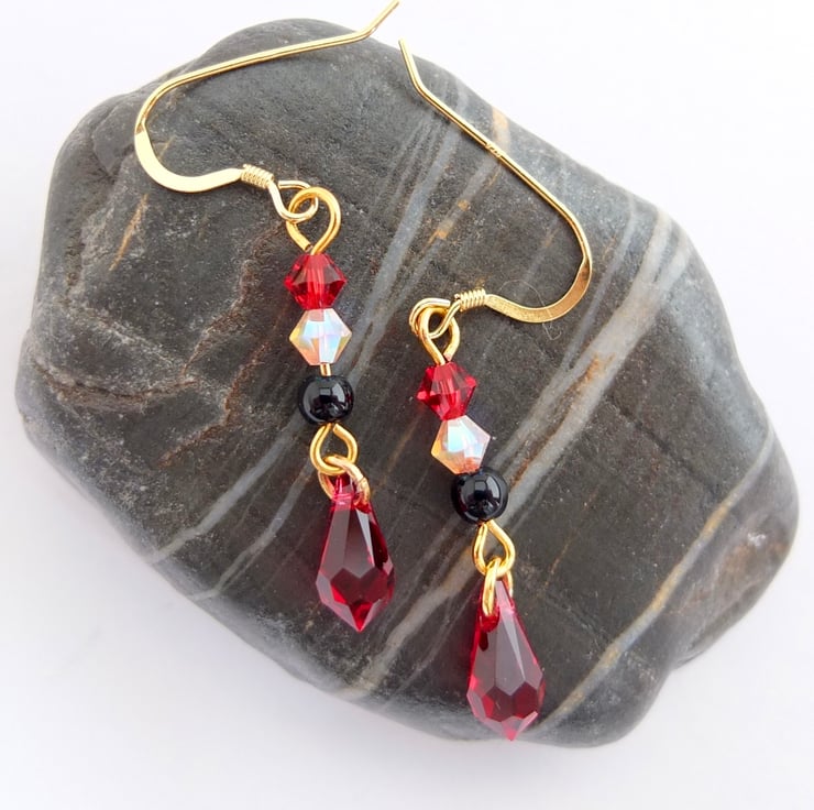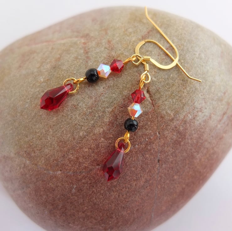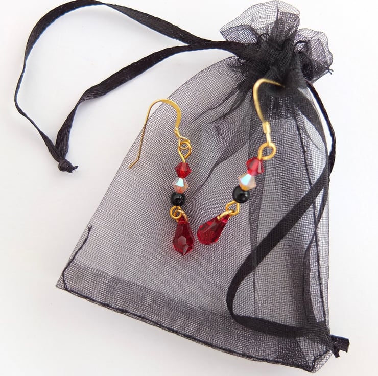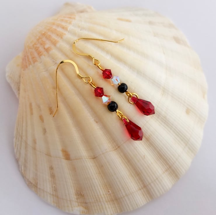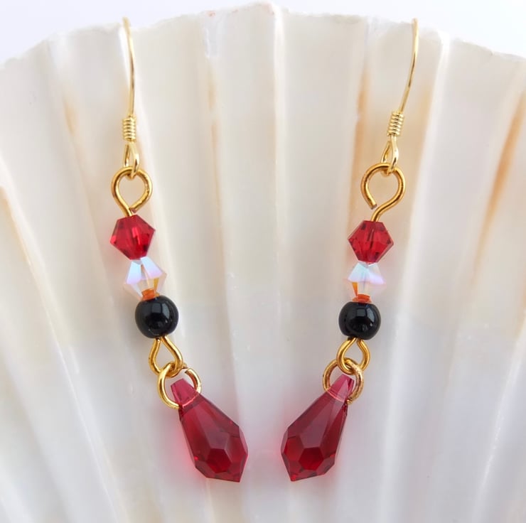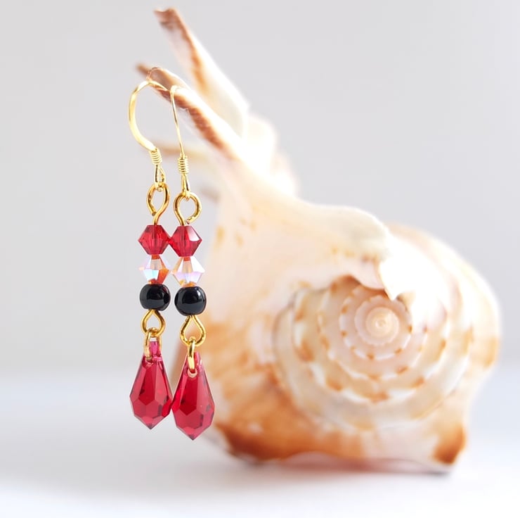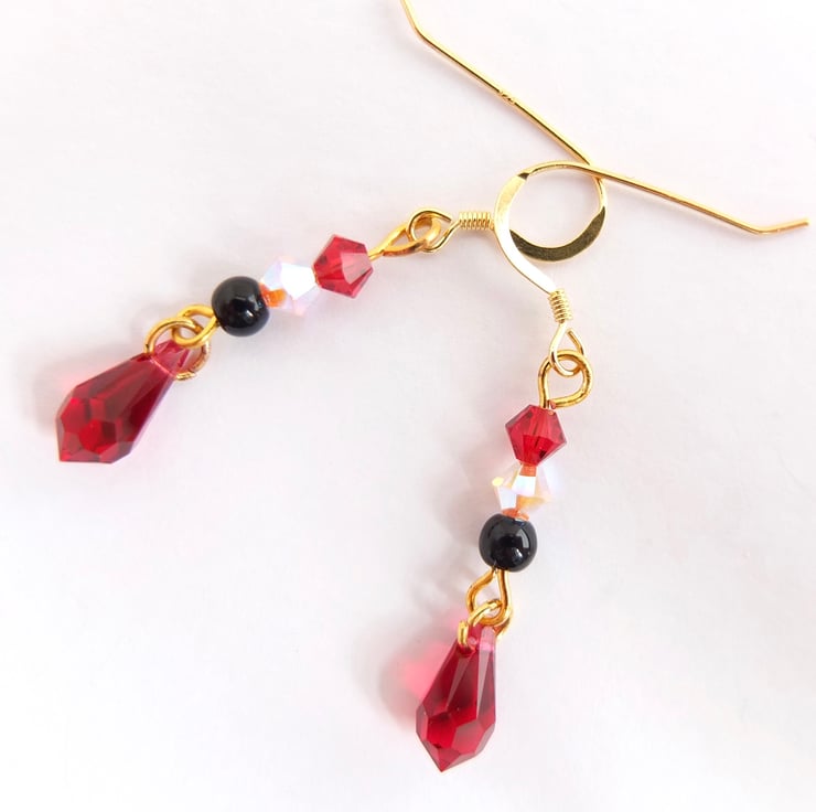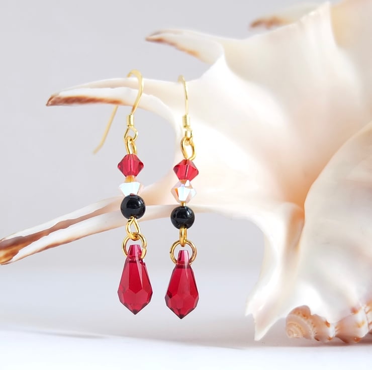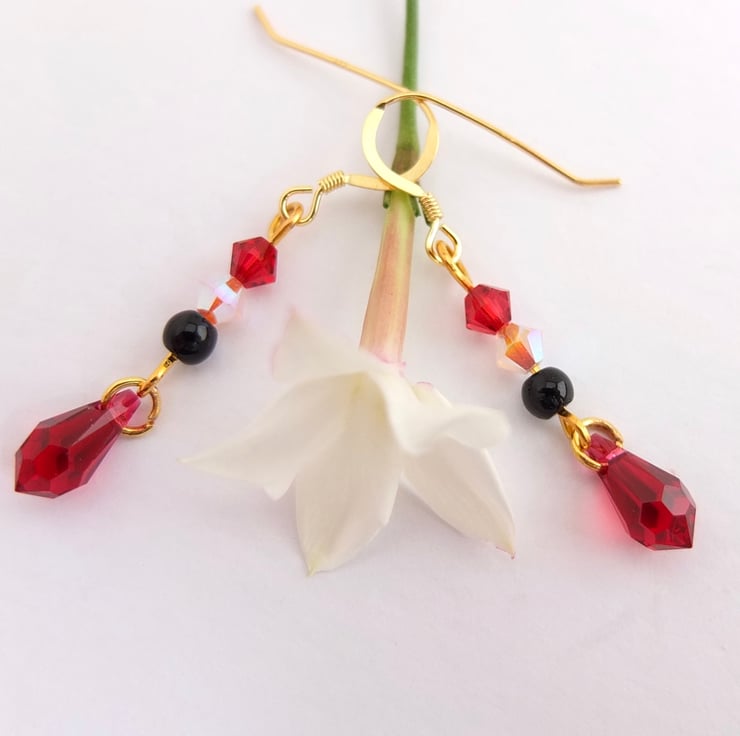 Above each pretty dangling scarlet Swarovski crystal teardrop hangs a black onyx bead and two Swarovski crystal beads in rosewater opal and scarlet.