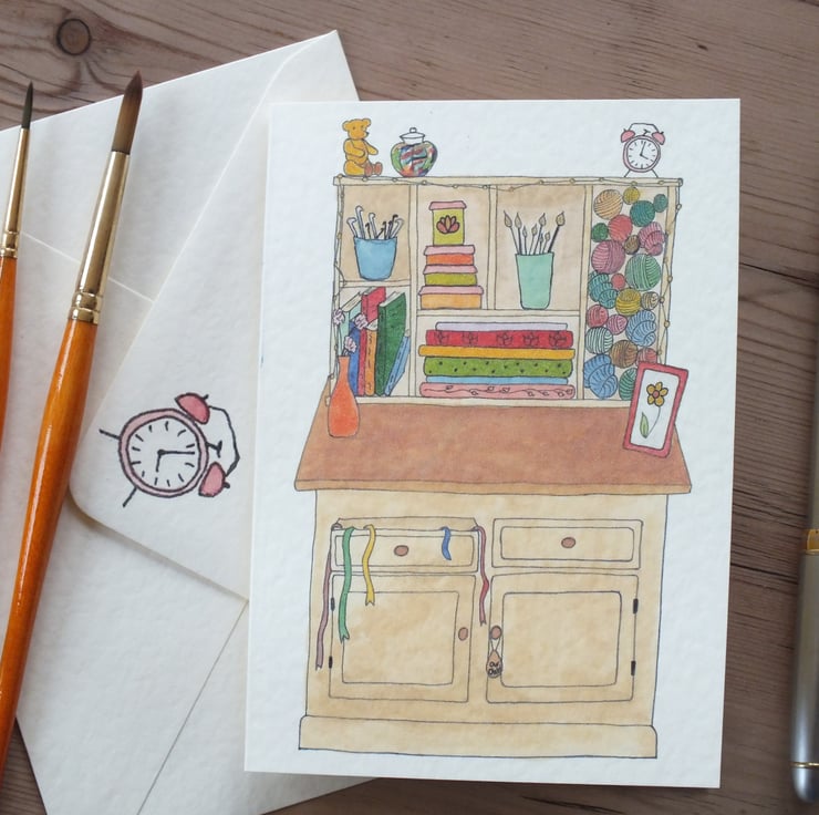 I use my tiny studio for all types of craft so my view when I am painting is of a lovely dresser crammed with all my crafting supplies – from paintbrushes to balls of yarn. I couldn’t resist painting it.