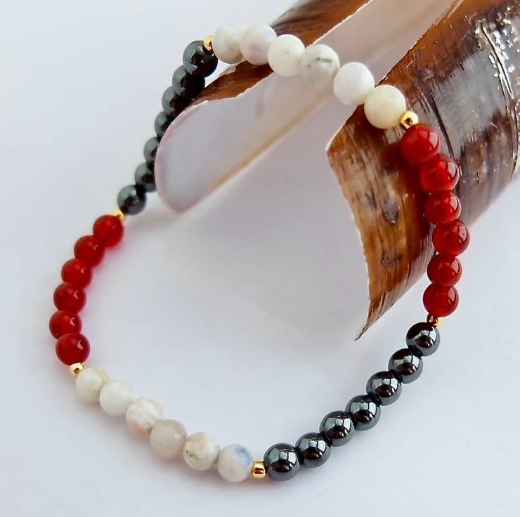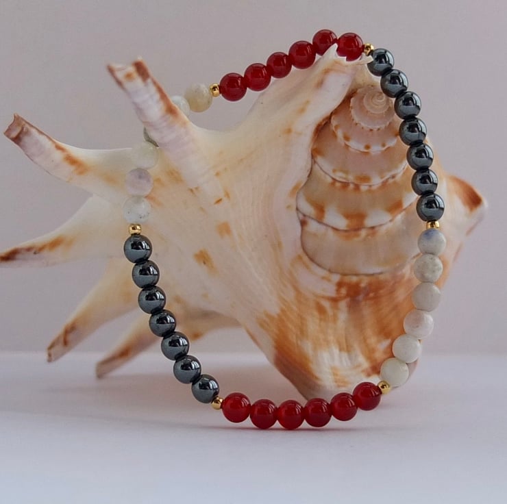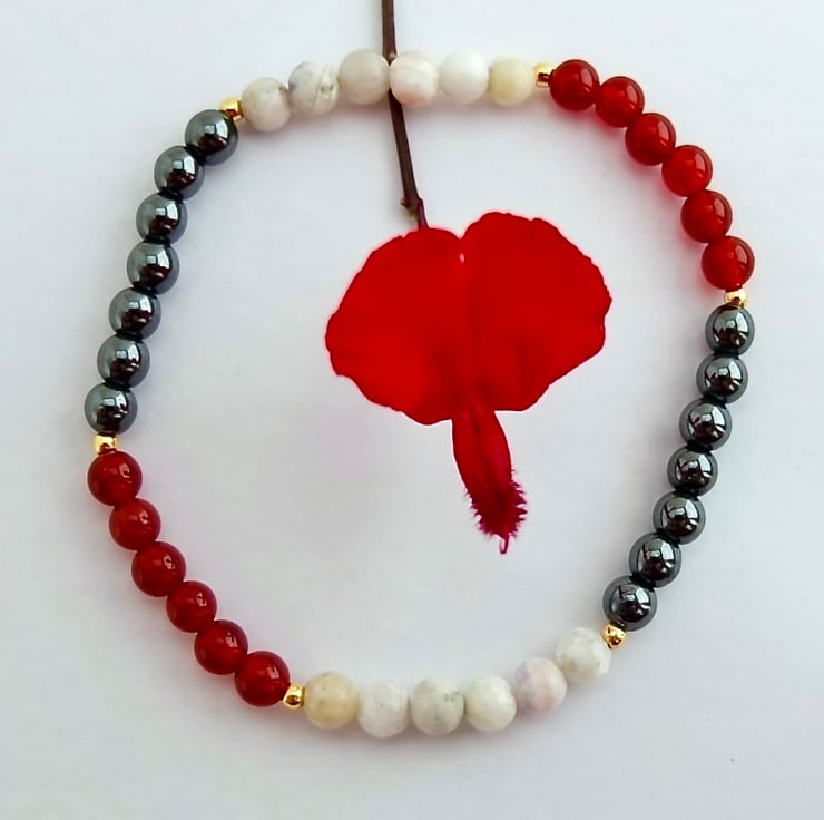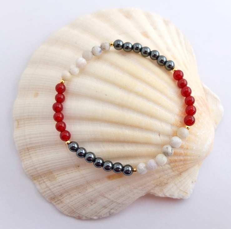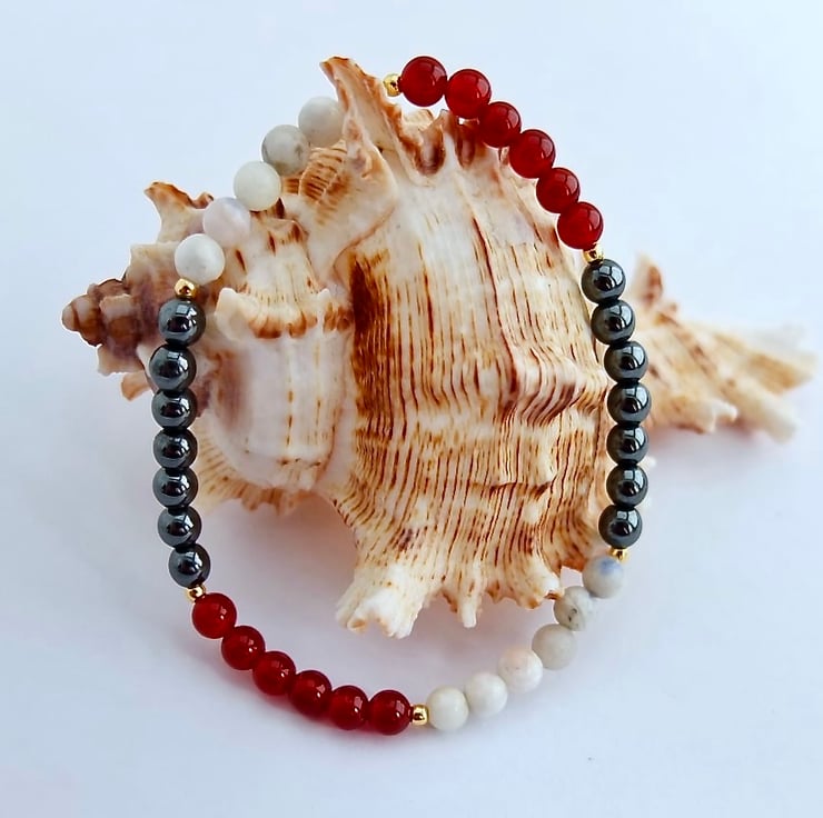 Pretty elasticated bracelet featuring beads of red carnelian, hematite and white sodalite separated by tiny gold vermeil beads.