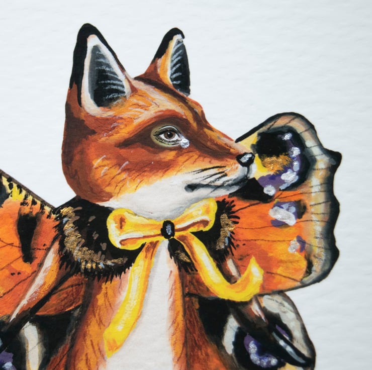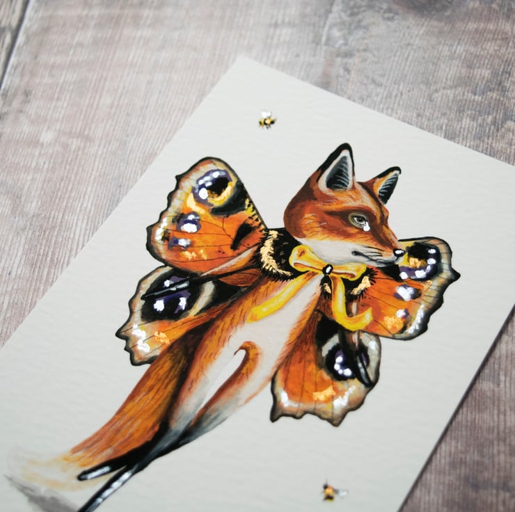 A mini art print, self illustrated, of my character Kevin the fox butterfly. What a hoot he is! The print is hand embellished with iridescent white and gold paint which subtly shimmers in certain light.