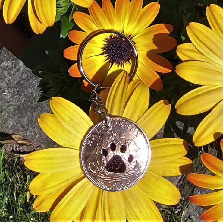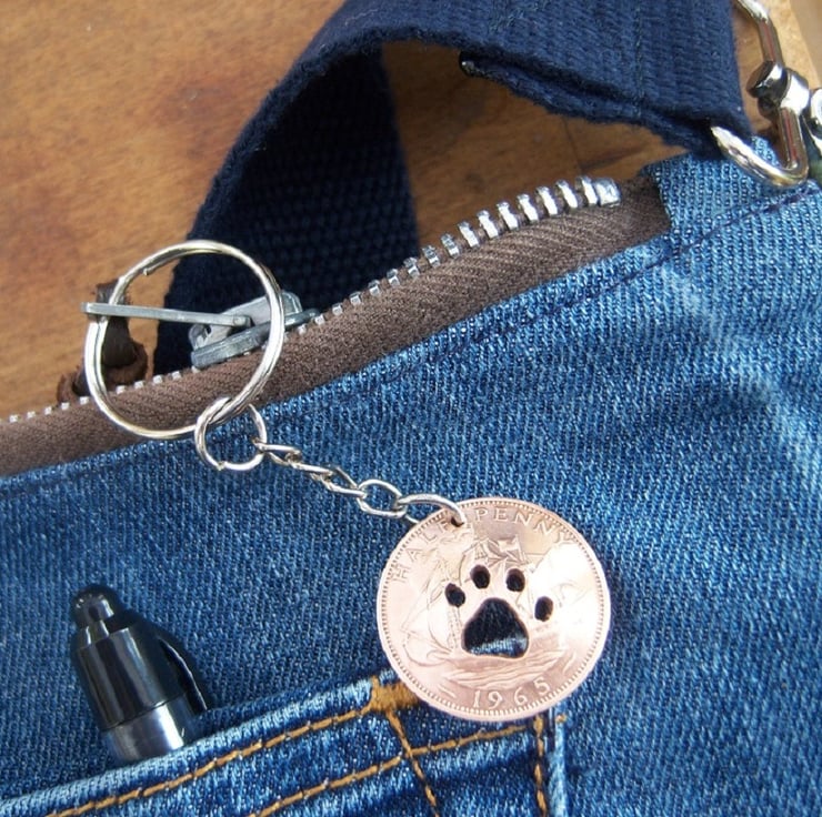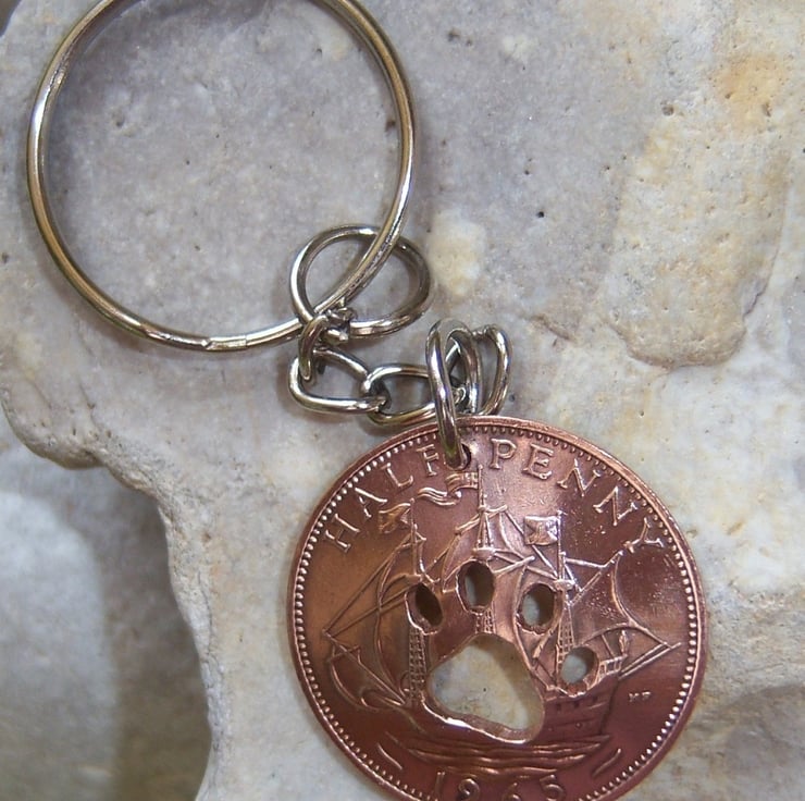 This paw has been hand cut into a pre-decimal bronze halfpenny coin with a fine-bladed jewellers saw - NOT with a machine/laser. The coin shows the ship on the reverse as the front and has been domed slightly.