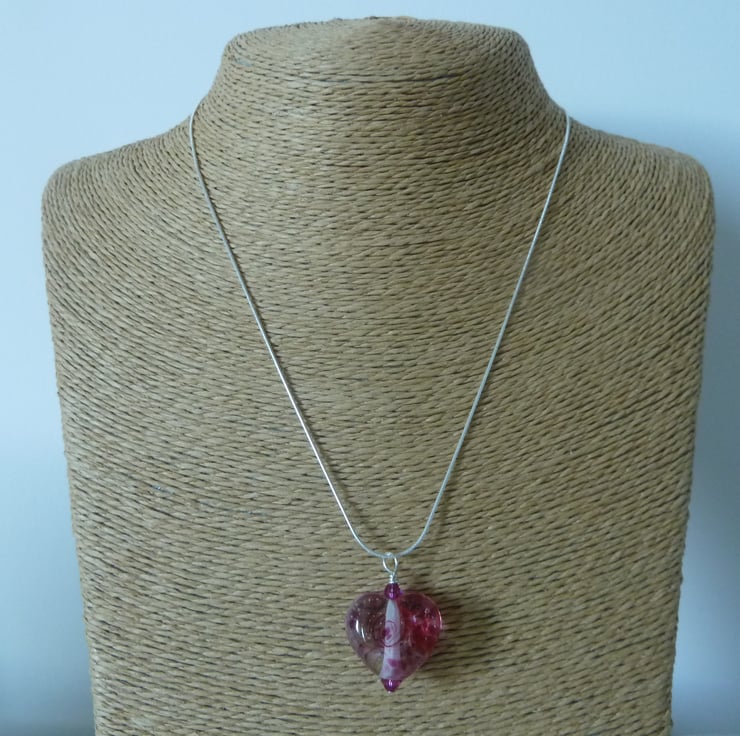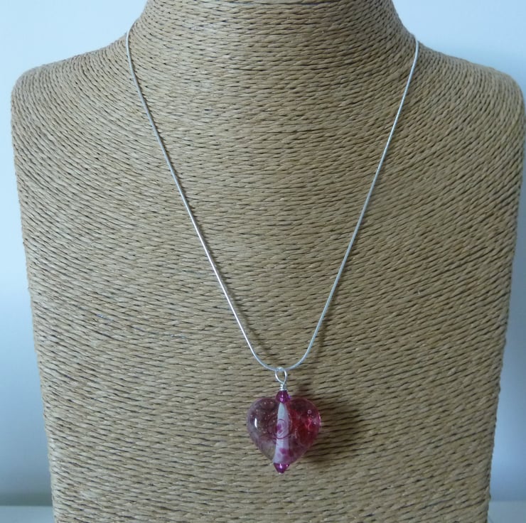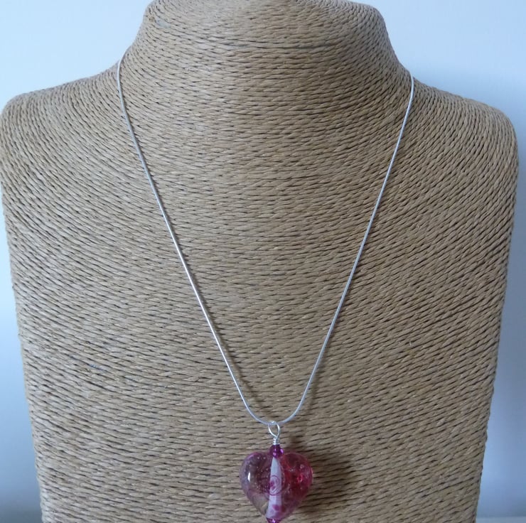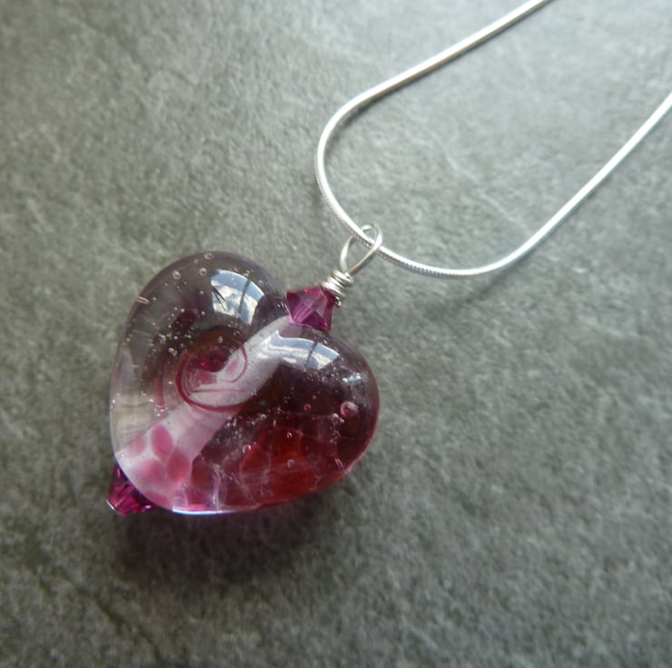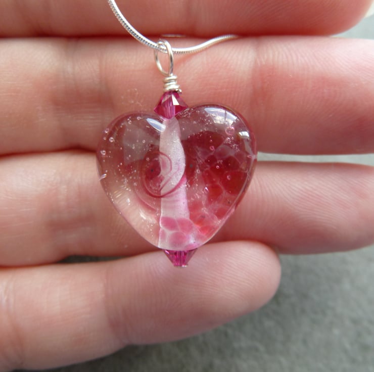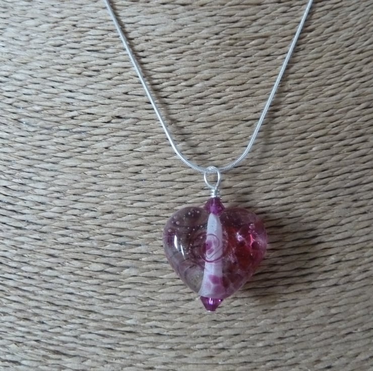 A sterling silver snake chain which has been strung with pink swarovski crystals and a handmade lampwork glass heart pendant.