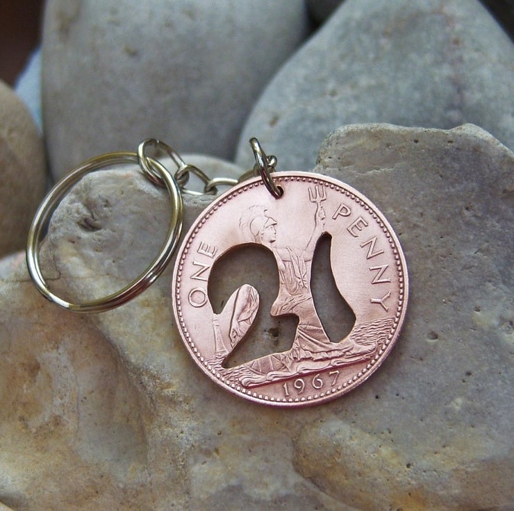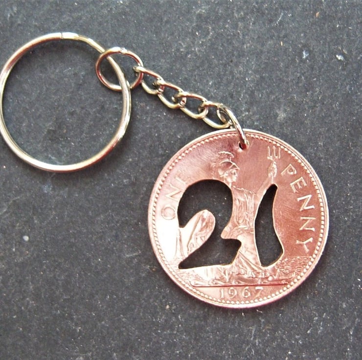 This is a penny coin from 1967. The number 21 has been hand cut out with a small jewellers saw, NOT by machine/laser.