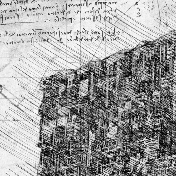 Text on the print is Da Vinci's mirrored short hand and is taken from some of his works, text is undecipherable as this is the mirrored shorthand Da Vinci wrote in when he did not want people to read what he was writing.