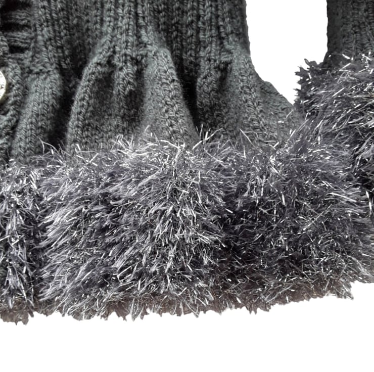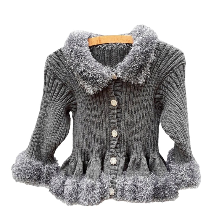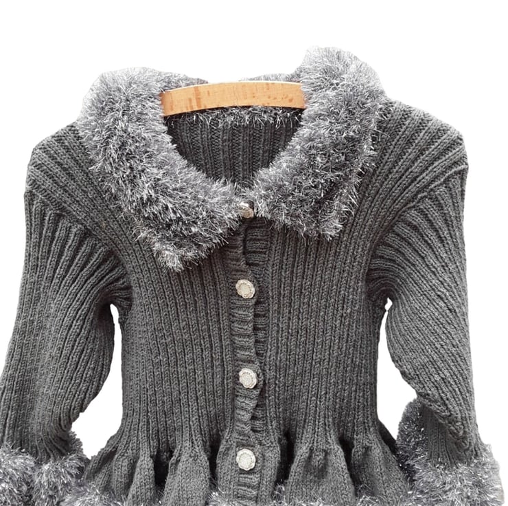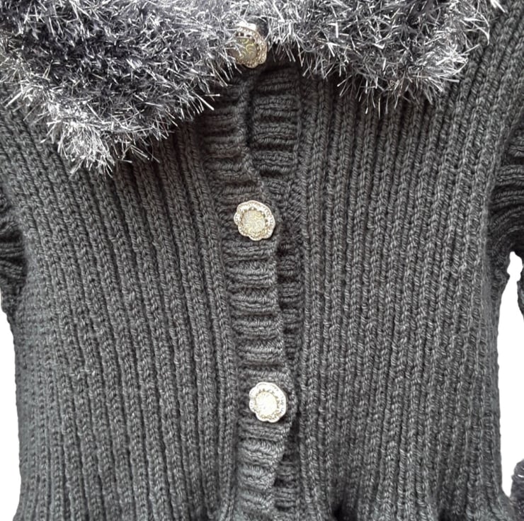 The magic unfolds in the meticulous details, where the full peplum hemline and sleeve cuffs showcase a delightful grey tinsel yarn trim. Although not actual tinsel, this yarn elegantly sparkles, resembling the glistening effect of genuine tinsel. The same sparkling tinsel yarn graces the collar around the round neckline, adding that extra hint of dazzle.