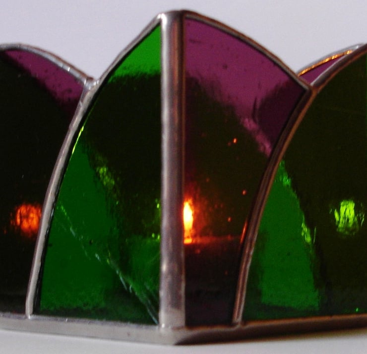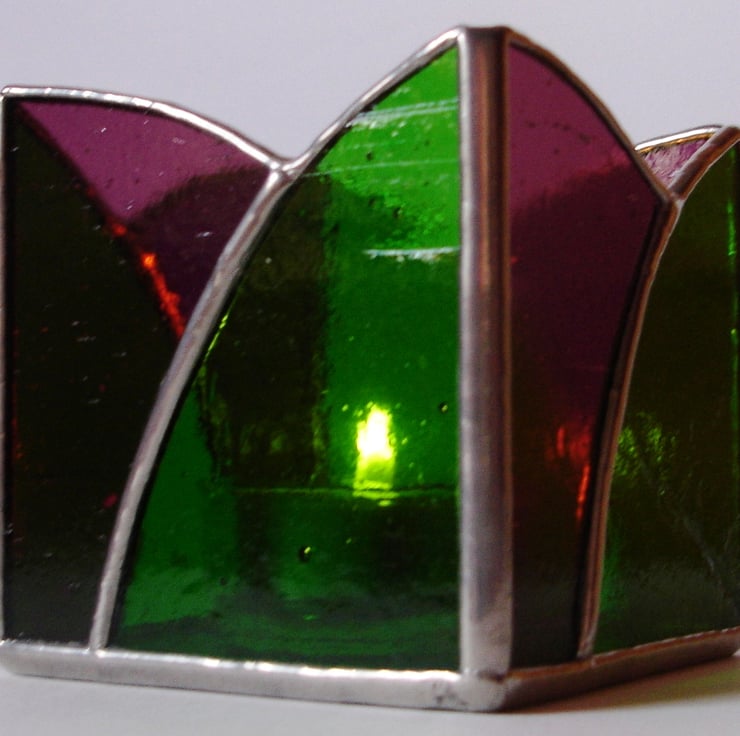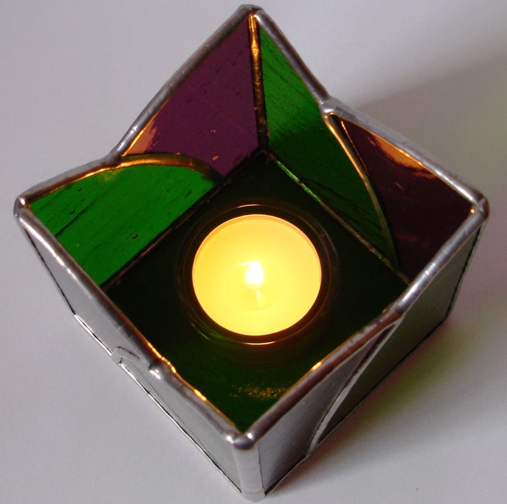 An elegant stained glass Tea Light Candle Holder inspired by the Art Deco period. We have used Kokomo restoration glass in Pink and Green. Hand-crafted using the Tiffany method of stained glass making, each piece of glass is cut by hand and the edges are wrapped in copper foil tape which is burnished to the sides of the glass. The pieces are then soldered together to form the cube and it is then polished by hand. A lovely addition to your home or ideal as a gift for any occasion.