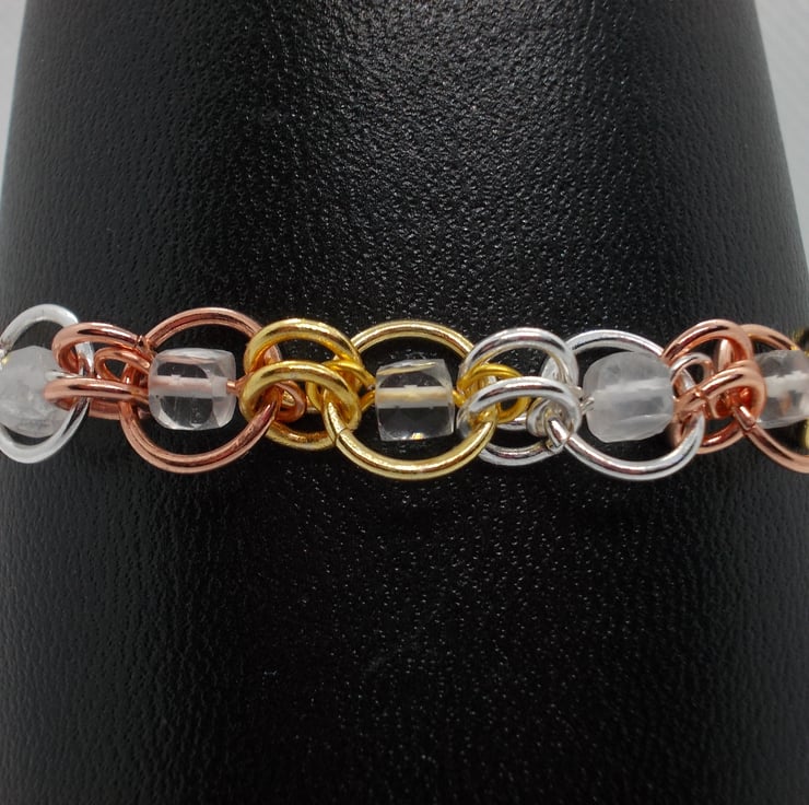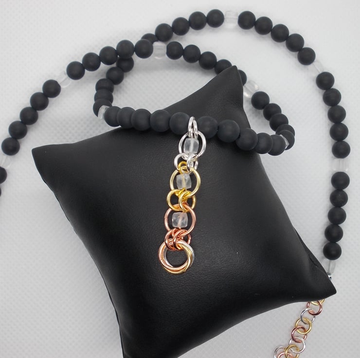 This necklace and bracelet set features a chainmaille bracelet with clear quartz cubes captured in jumprings. The necklace is a base of matt black agate and clear quartz cubes with a chainmaille pendant.