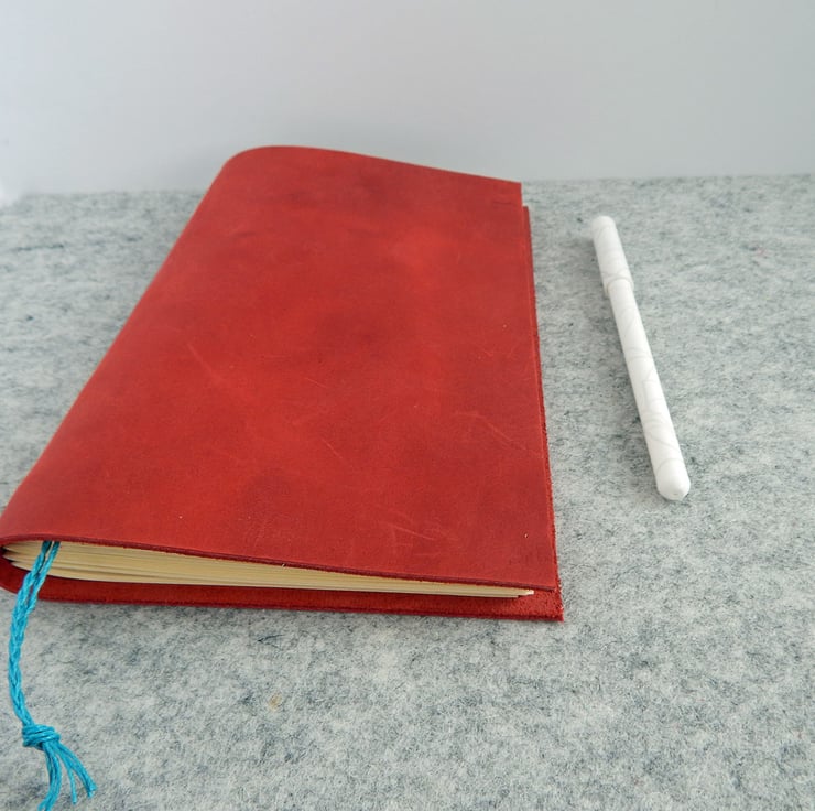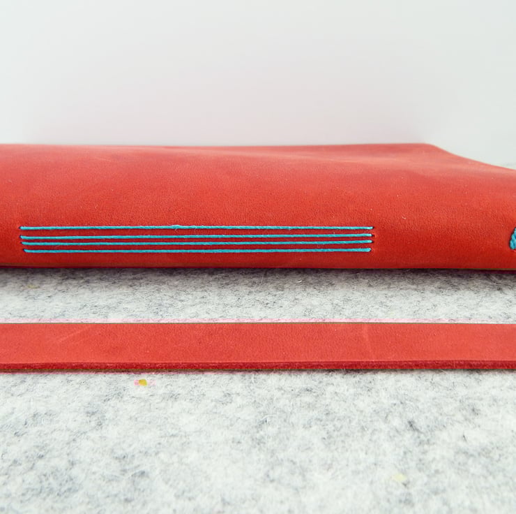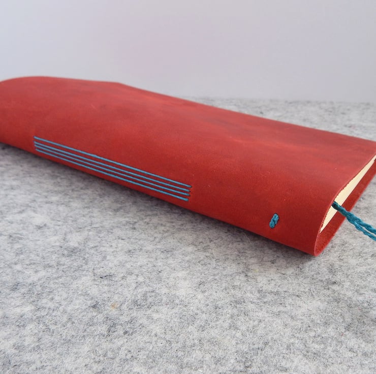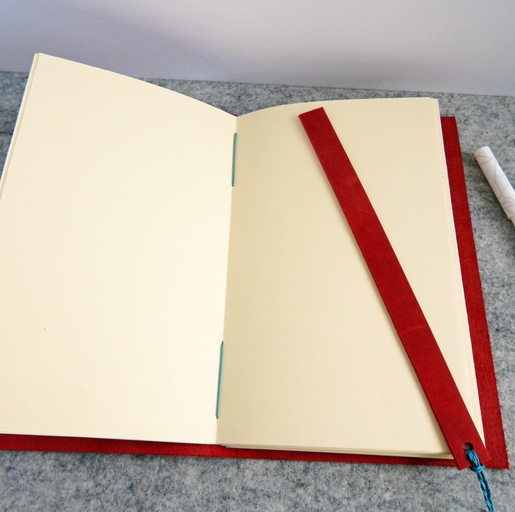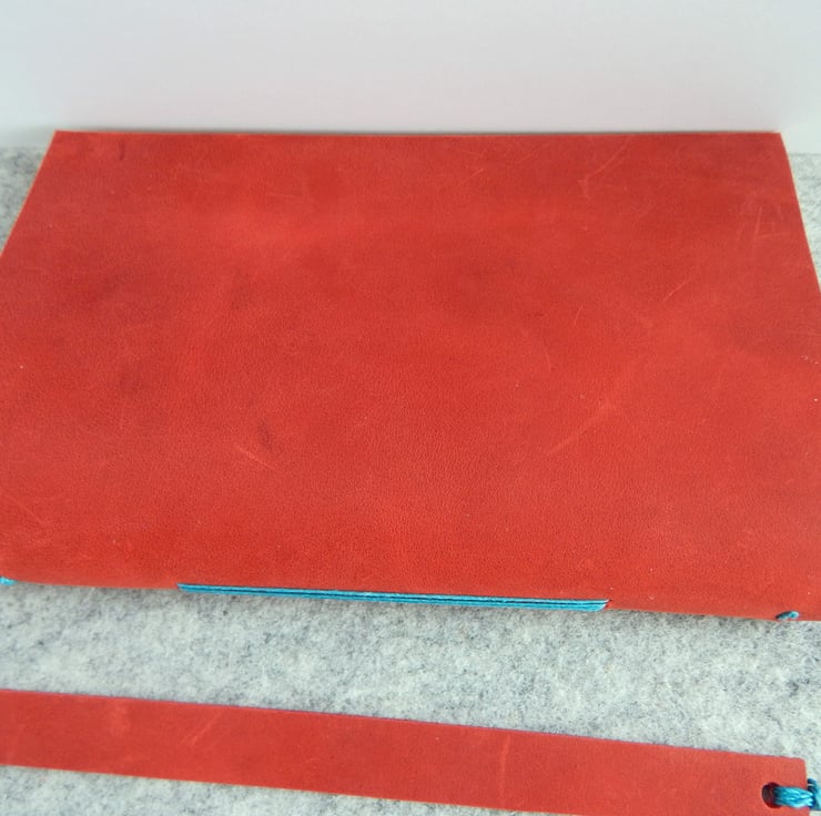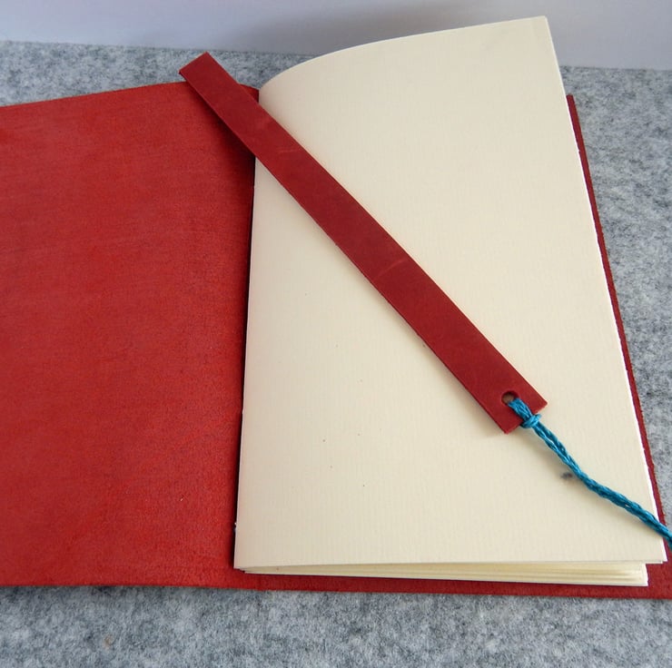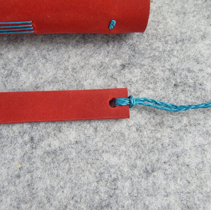There is a matching bookmark, made with a left-over strip of the leather and with a hand made turquoise linen cord trim.