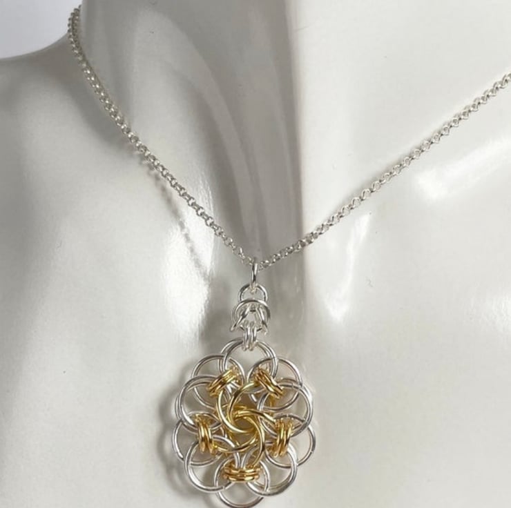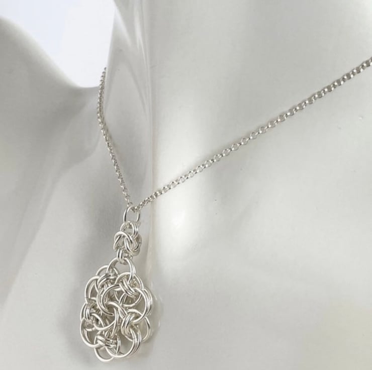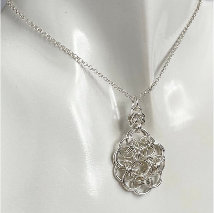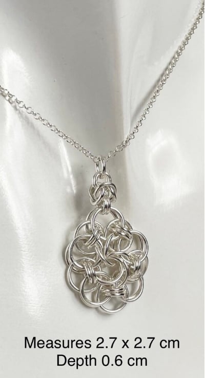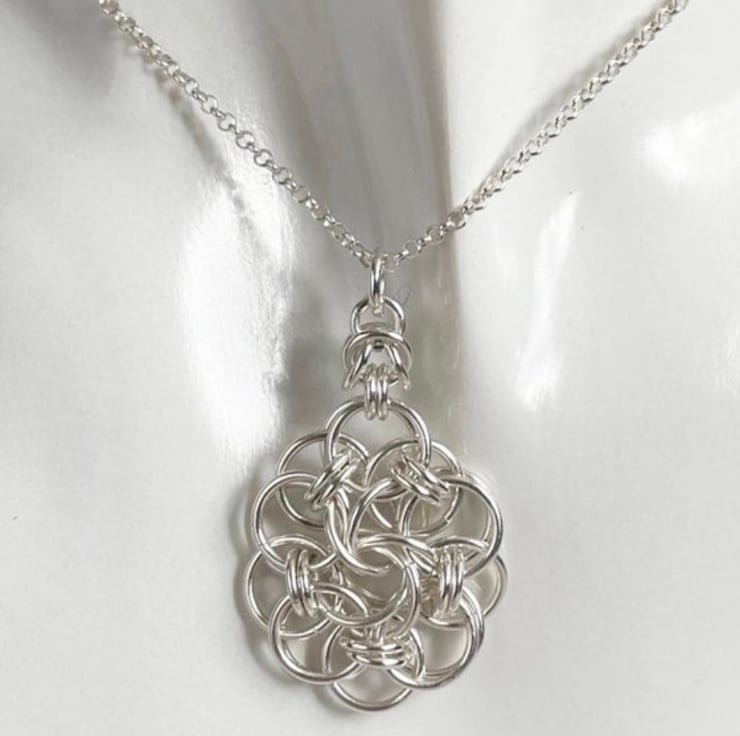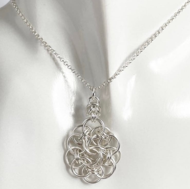 Unique Chainmaille sterling silver medallion style pendant, with an 18 inch chain.