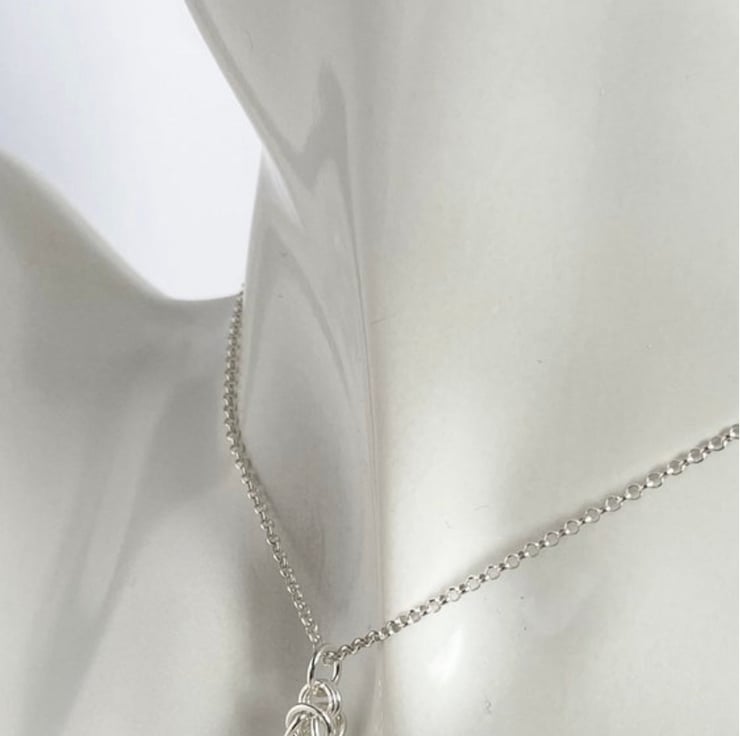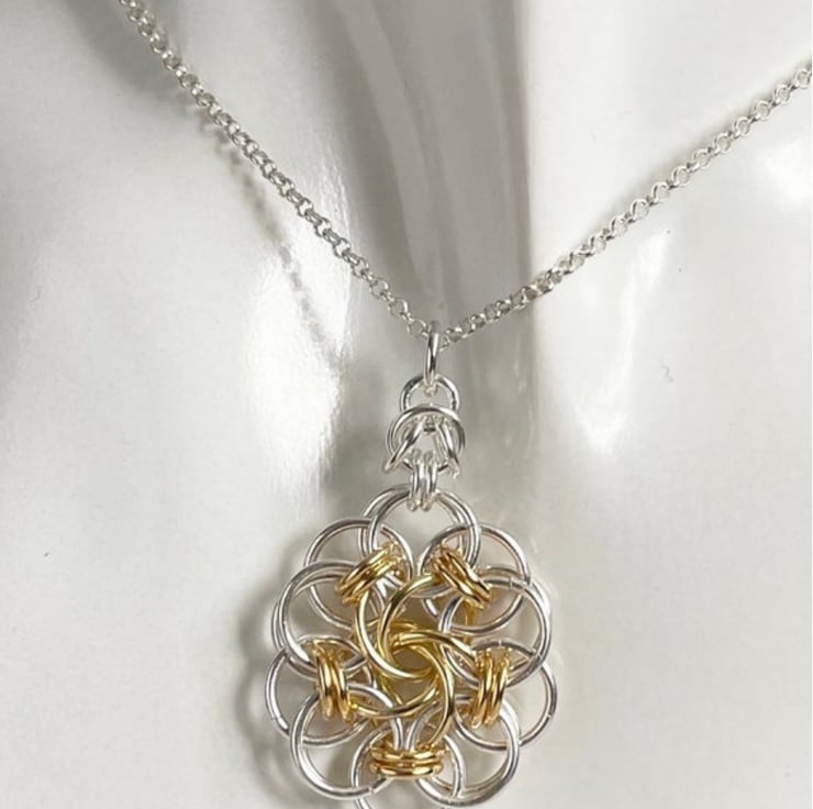 Sterling silver rings create this eye catching chainmaille pendant, which has a vortex detail in the centre of the pendant.
